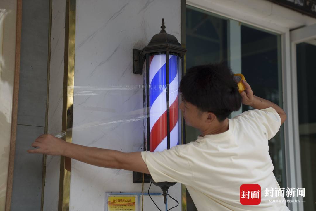 9月23日,珠海香洲区,理发店老板加固店门口的装饰物。