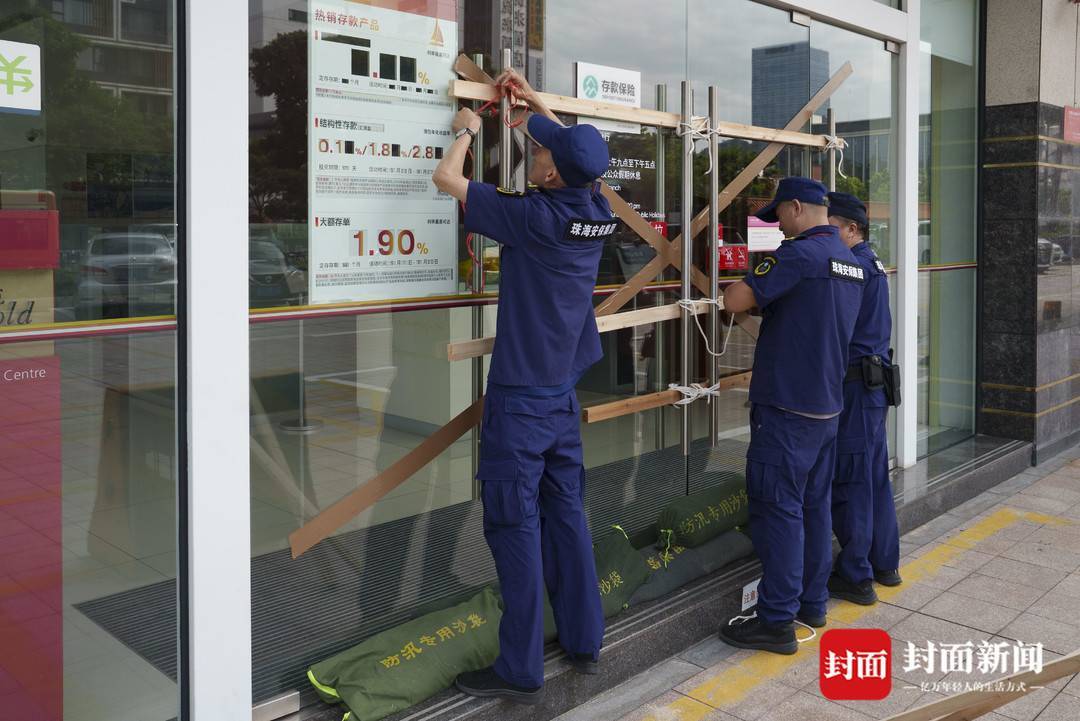 9月23日中午,封面新闻记者在珠海市香洲区见到,当日12时前后,当地已陆续实行“停工、停产、停运、停业”措施,商店、饭店、银行等在歇业的同时,也有员工为大面积的玻璃窗陆续贴上胶条或者盖上木板,以减轻大风的影响;记者在多个沿海小区还了解到,为了预防海水倒灌和暴雨的破坏,这些小区的地库在9月22日起,已经提前通知业主将车辆移出,并在23日设置了挡水墙和沙袋,其中部分小区还提前剪掉了大树的部分树枝,以减轻影响。