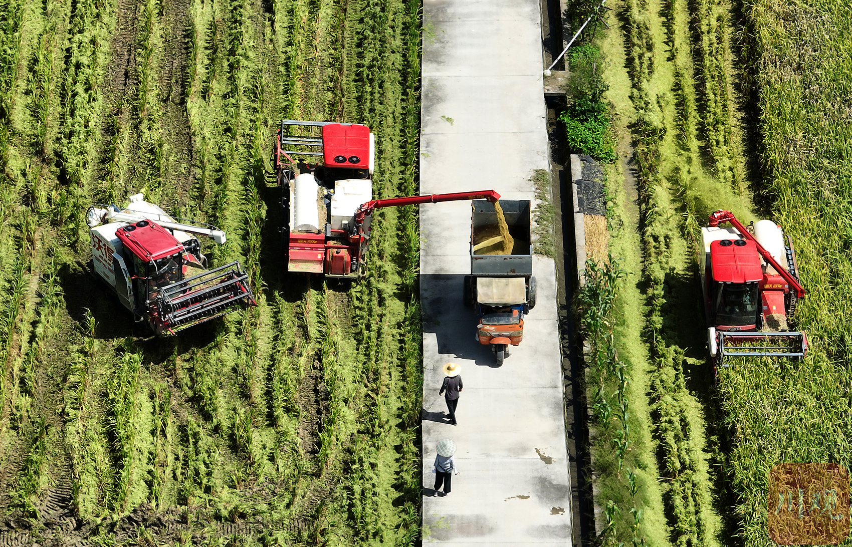 9月20日一早,在成都崇州市杨柳农民专业合作社,一辆刚从地里满载而归的稻谷运输车正在紧张卸货。坝场上,金黄色的稻谷已堆成一座小山。