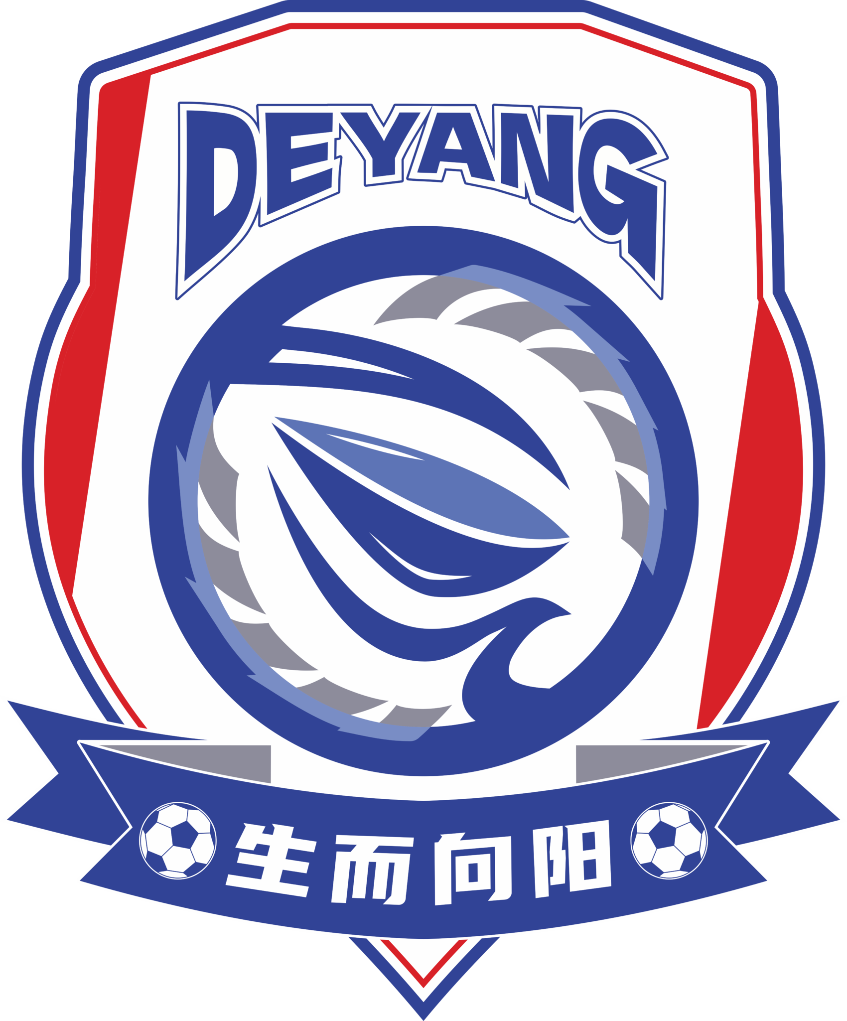 队徽上方为英文字样“DEYANG”,设计动感,突出国际化气息,下方绶带书写球队格言“生而向阳”,两侧点缀足球图形,寓意以足球运动为媒介,焕发德阳文化新活力。