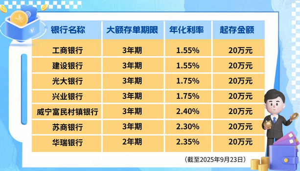 与之形成对比的是,民营银行的大额存单在低利率背景下备受追捧,成为部分投资者眼中的热门产品。例如,截至9月23日,苏商银行推出的2年期、3年期两款大额存单产品,认购起点金额均为20万元,年利率分别为2.1%、2.3%;此外,华瑞银行2年期大额存单年利率为2.35%,但额度较紧缺,还会限制地区。