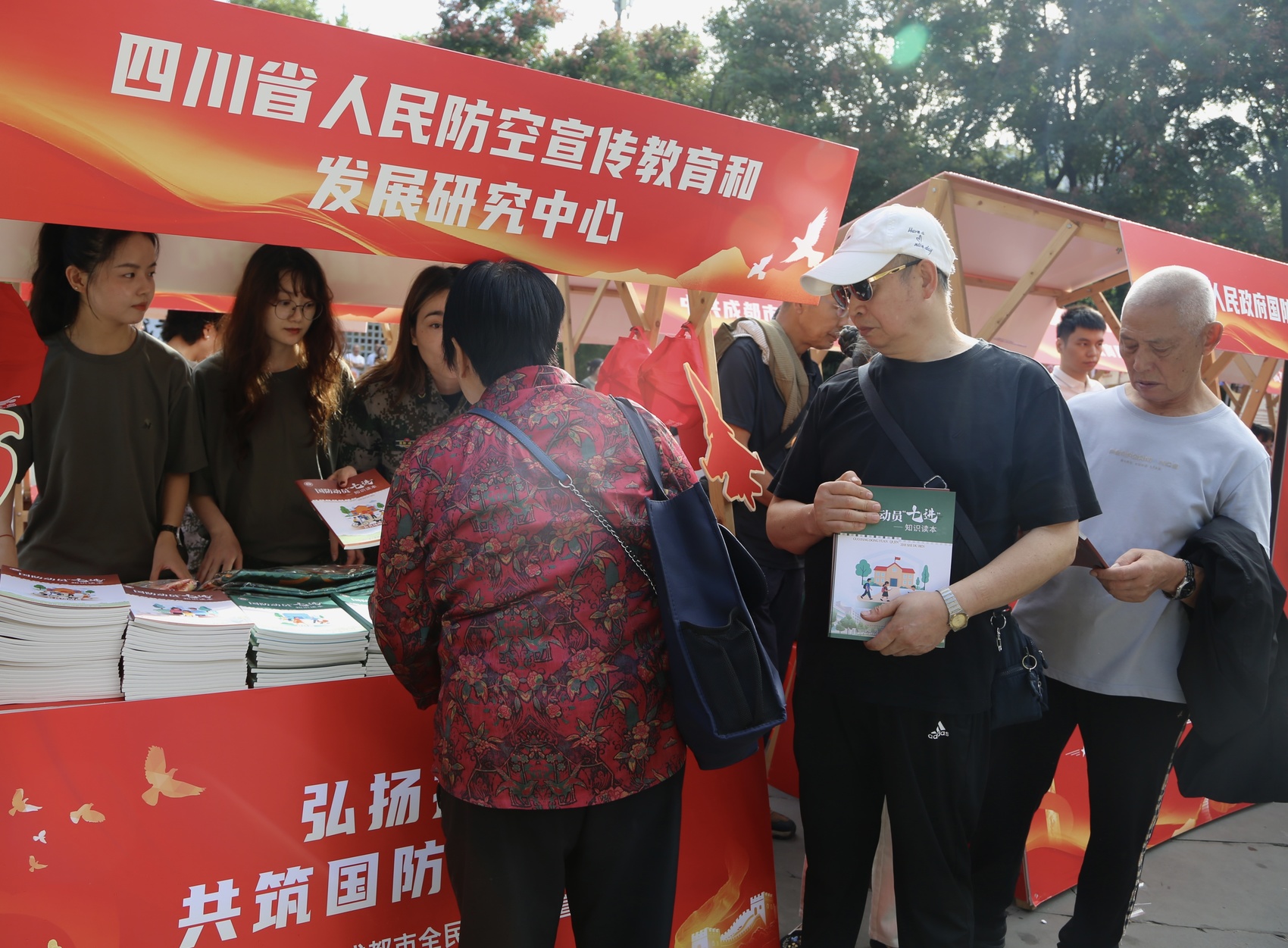 四川省人民防空宣传教育和发展研究中心工作人员向成都市民发放国防动员知识“七进”读本和文创产品。祖天丽 摄