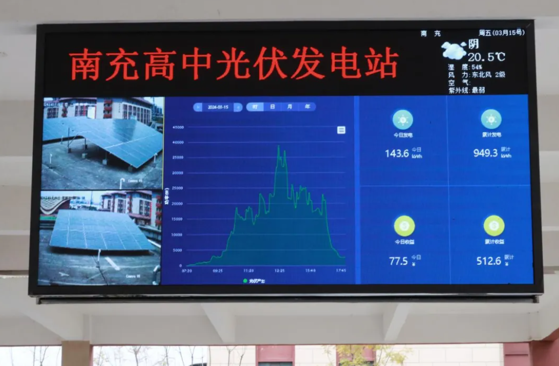 在南充高中高坪校区,3个会议室的屋顶都整齐排列着单晶硅组件,110块单晶硅组件平均每天发电144千瓦时,年均发电量超5.2万千瓦时,可以基本覆盖学校用电所需,在校园内形成了太阳能发电闭环。