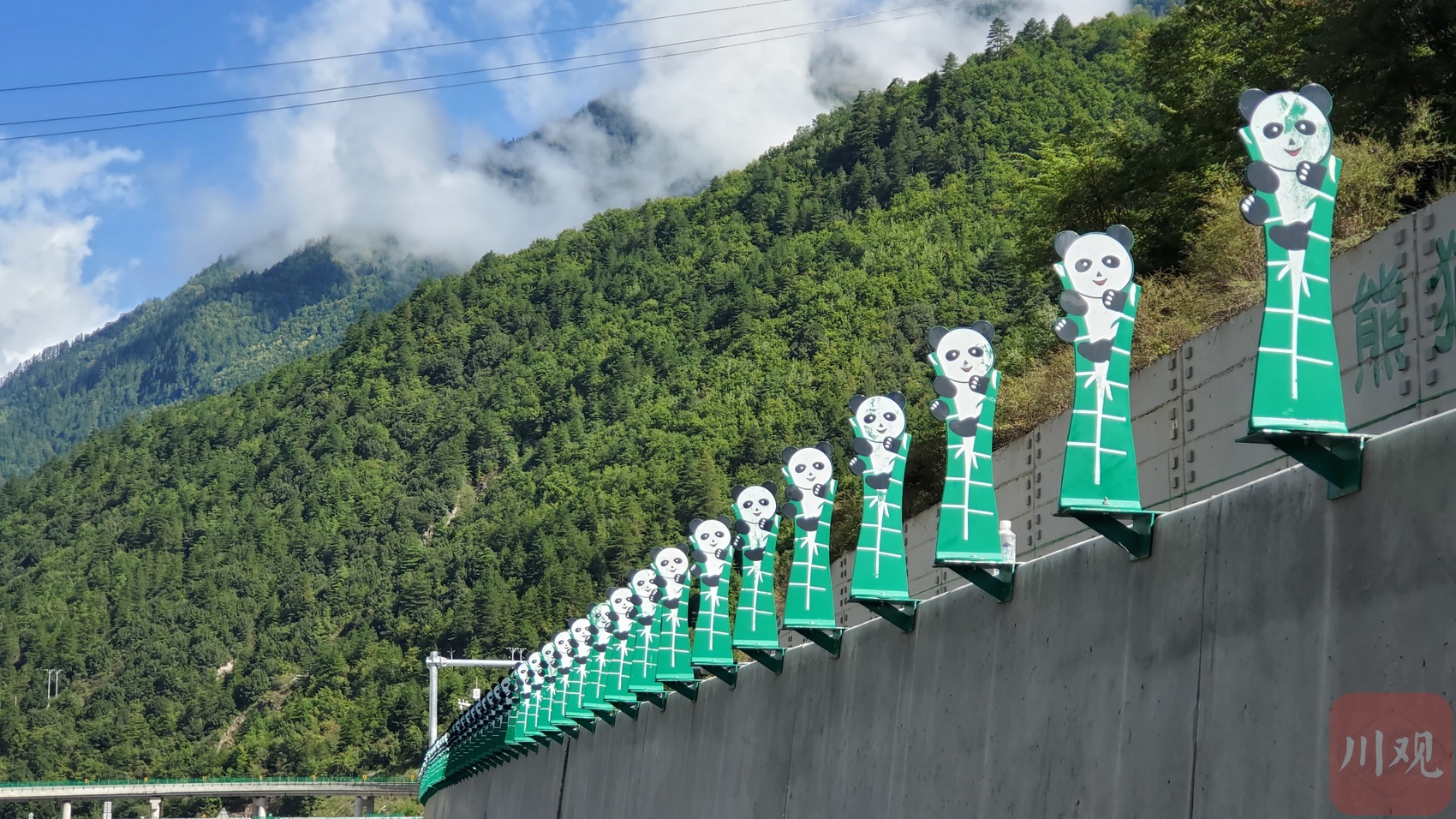 试跑时记者观察到,整条高速大熊猫“含量”极高,生态气息扑面而来。在白马隧道口,憨态可掬的大熊猫雕像坐在高速中间,举着手给过往车辆“打招呼”;平武互通出入口整体设计为大熊猫造型,与平武“天下大熊猫第一县”的称号对应。