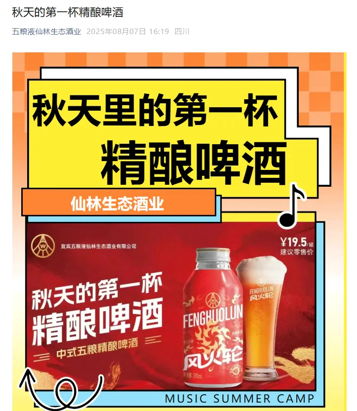 据“五粮液仙林生态酒业”公众号7日消息,该公司将推出一款名为“风火轮”的中式五粮精酿啤酒,单罐净含量390ml,建议零售价19.5元/罐。