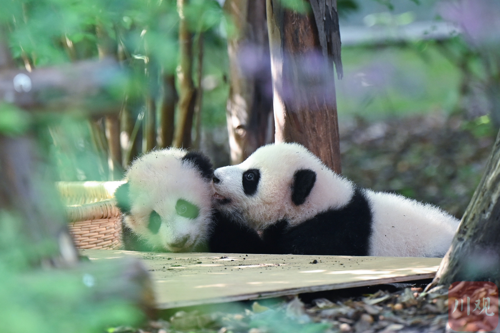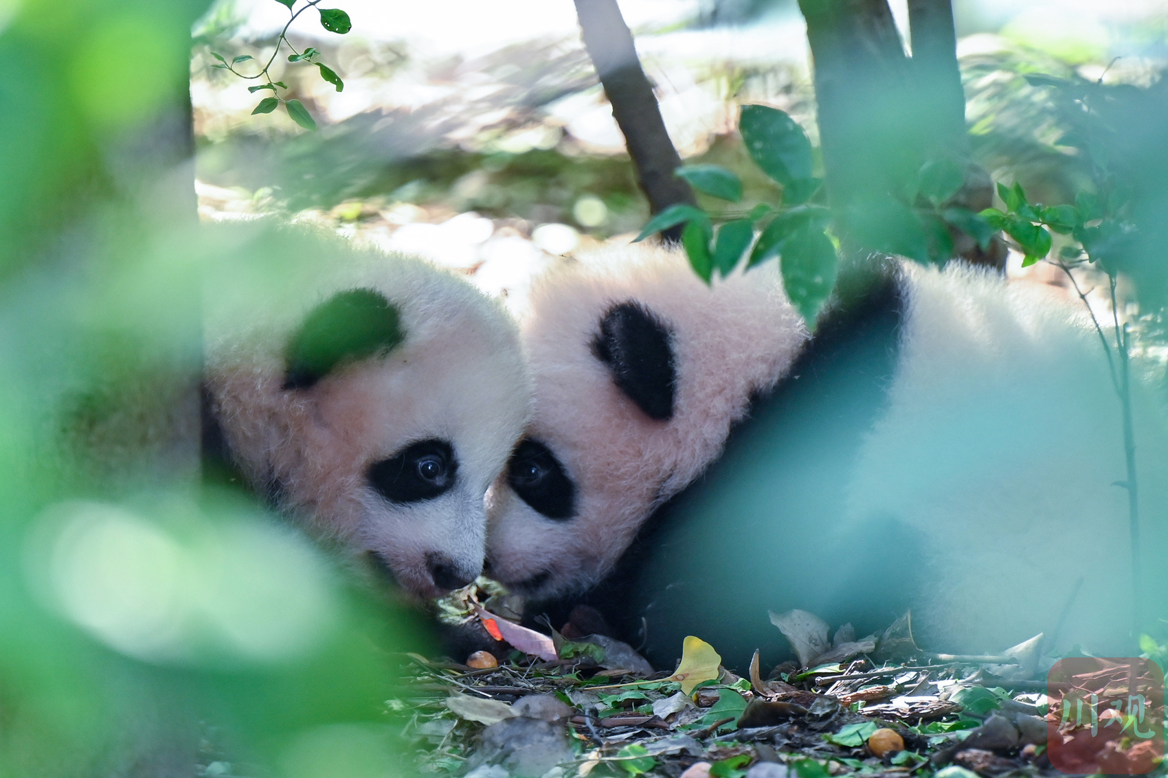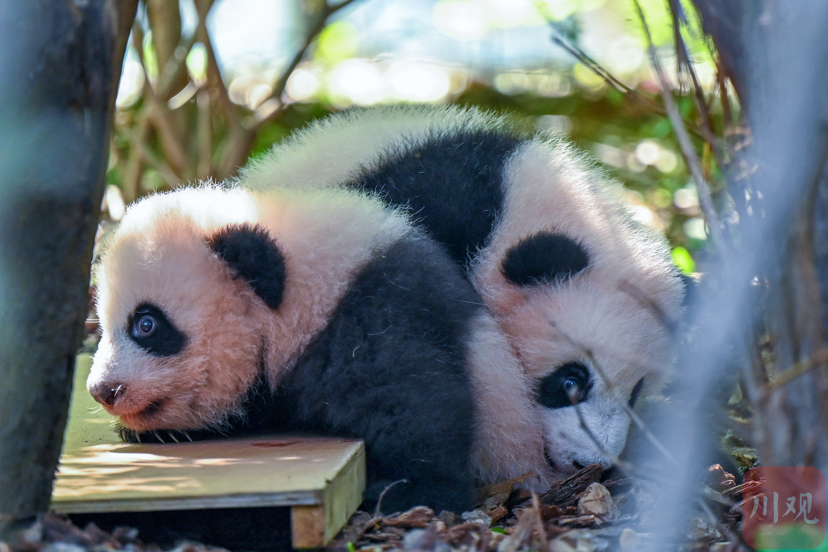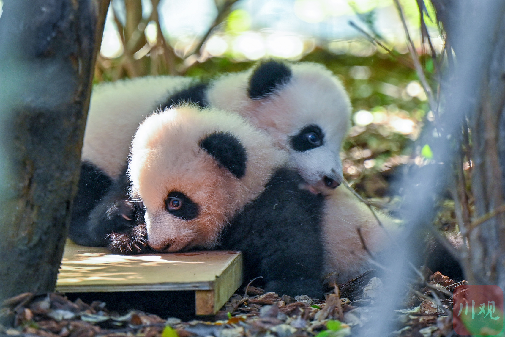 在月亮产房户外区,两只大熊猫幼崽依偎在一起,林荫下尽情享受秋日阳光。