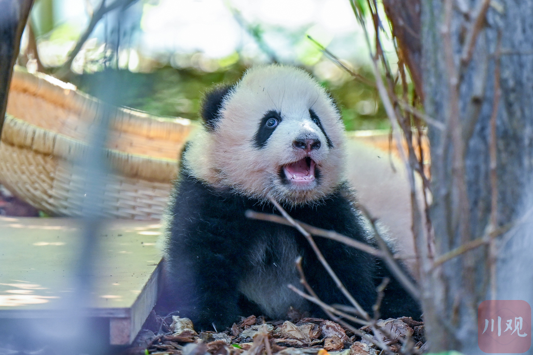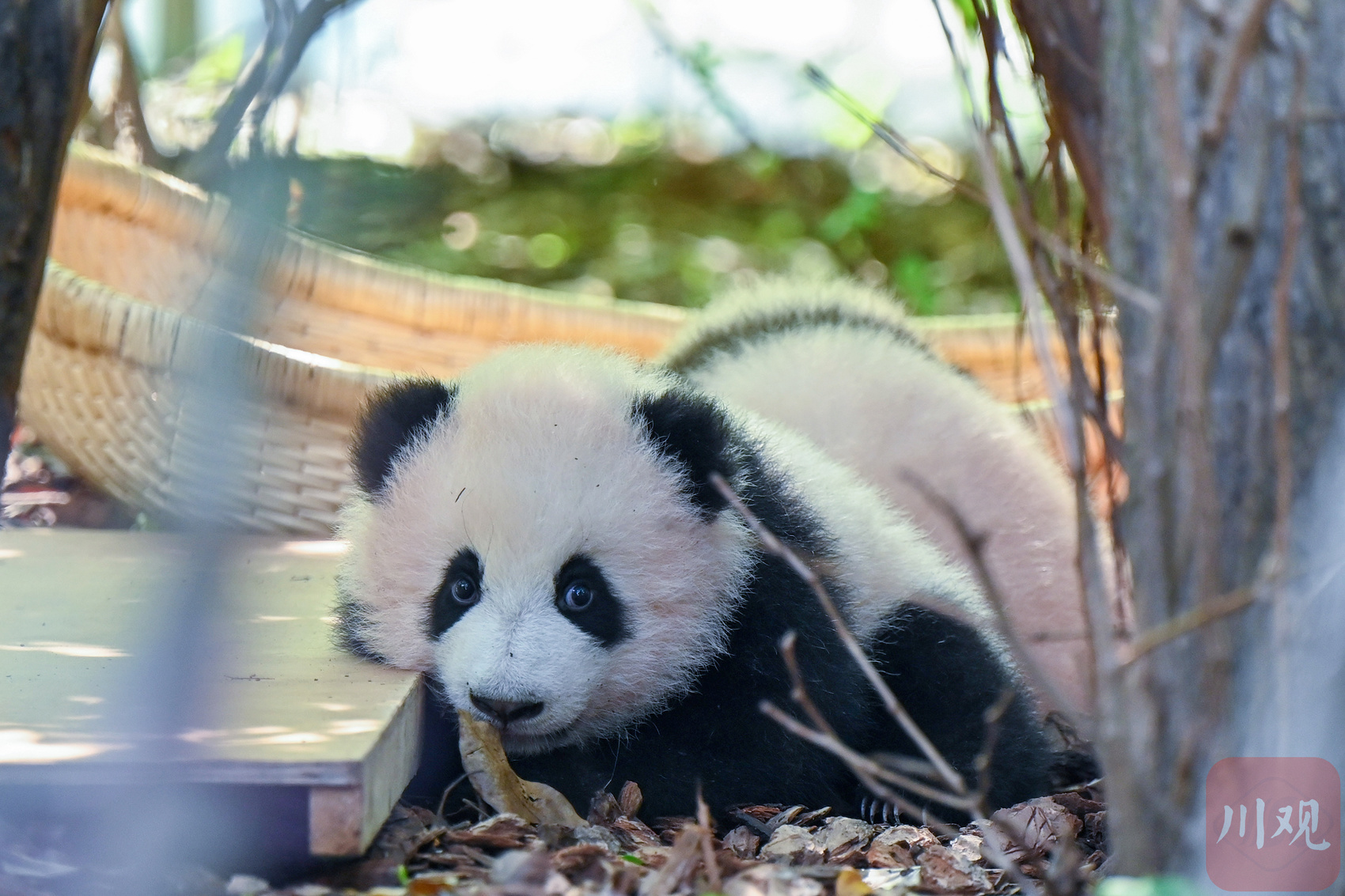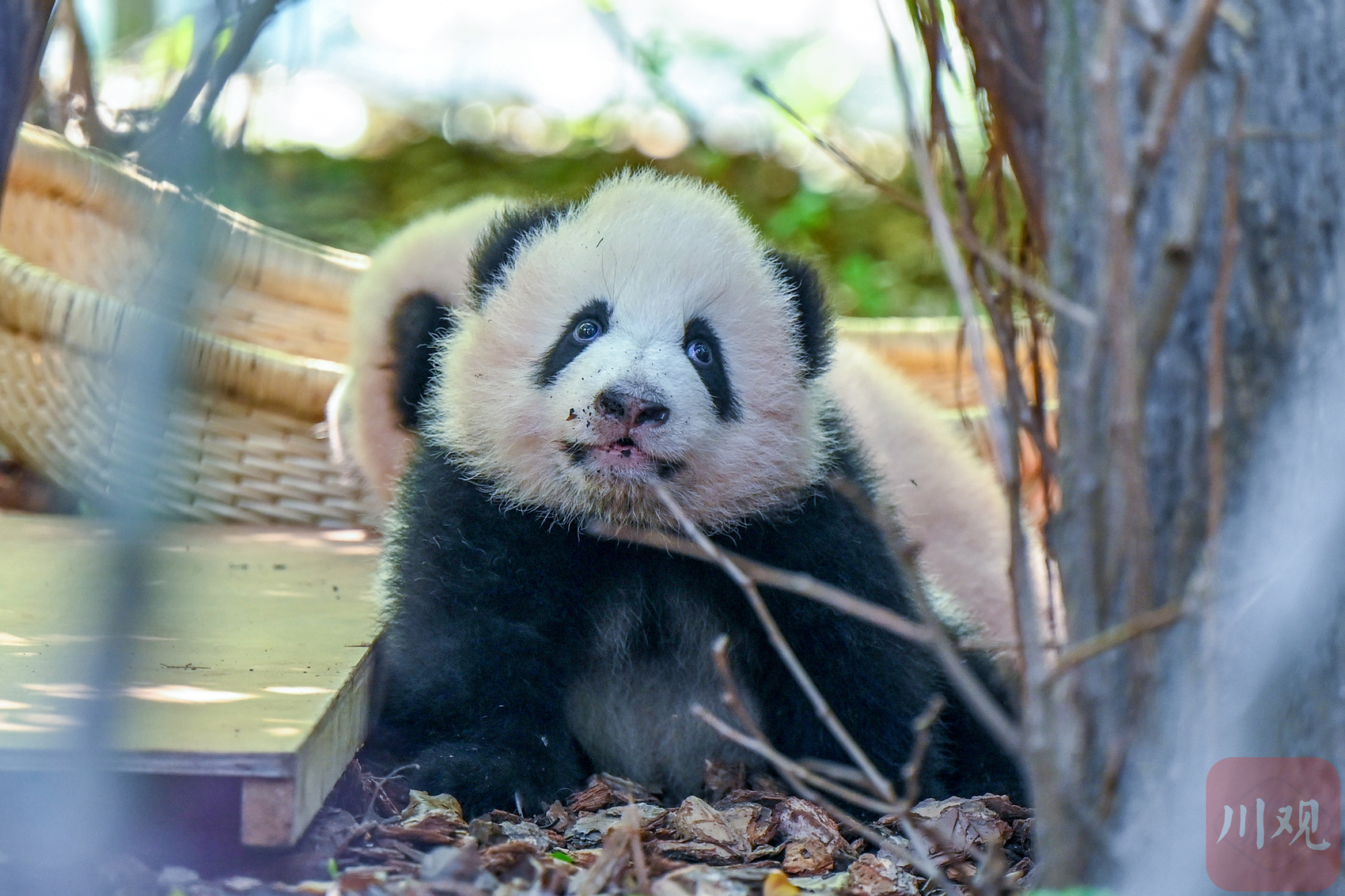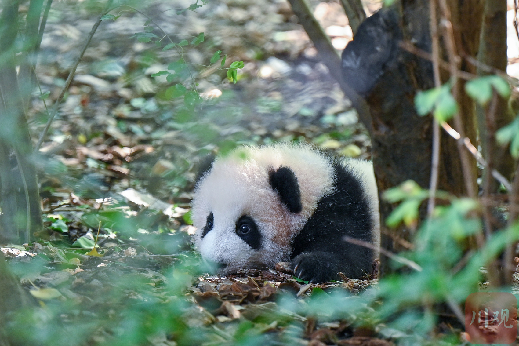 一只东张西望的熊猫幼崽,模样十分可爱。