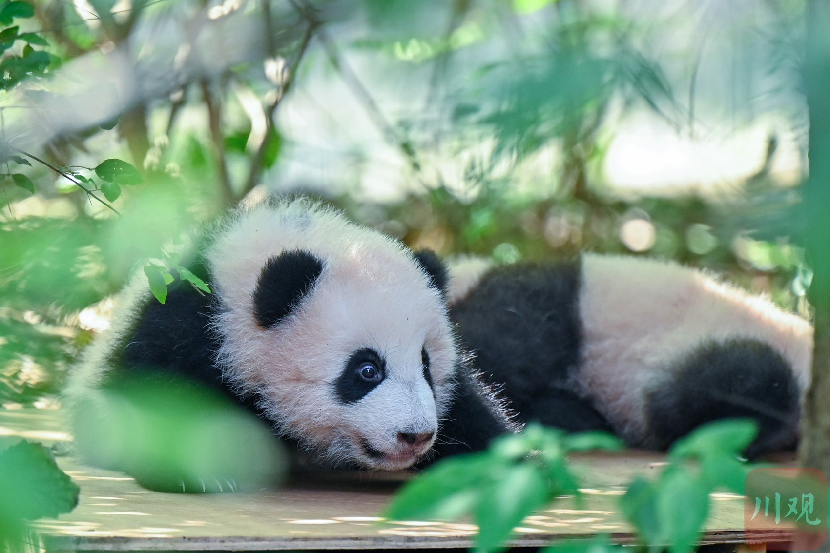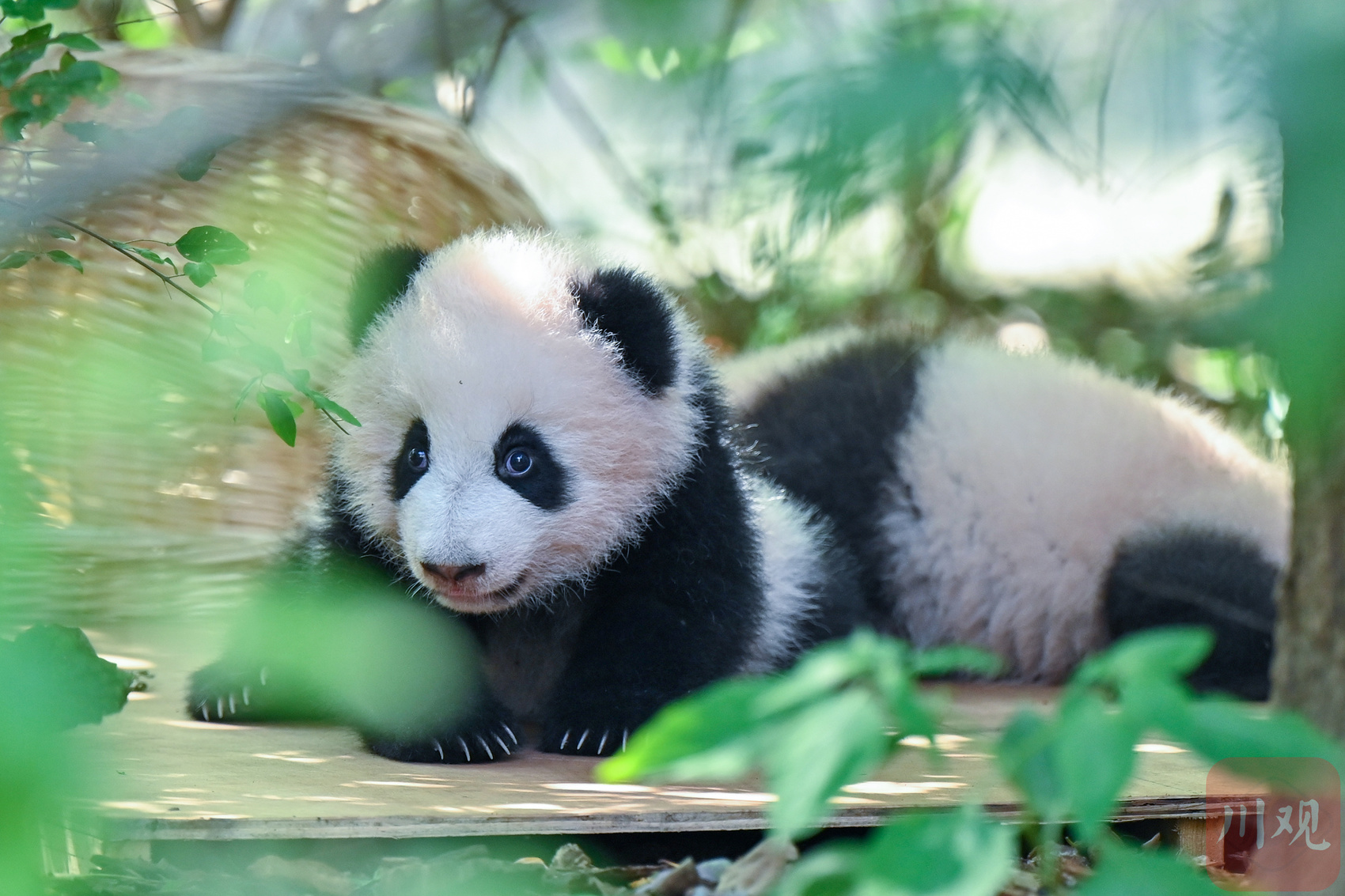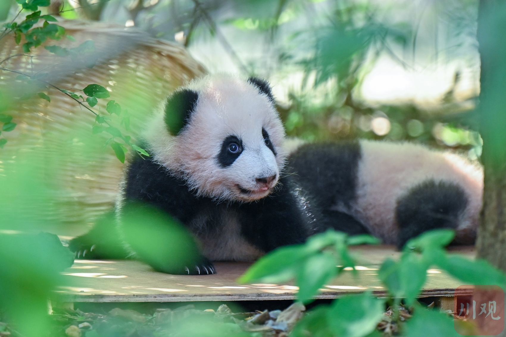 一只熊猫幼崽在绿植环绕的平台上东张西望,模样十分可爱。