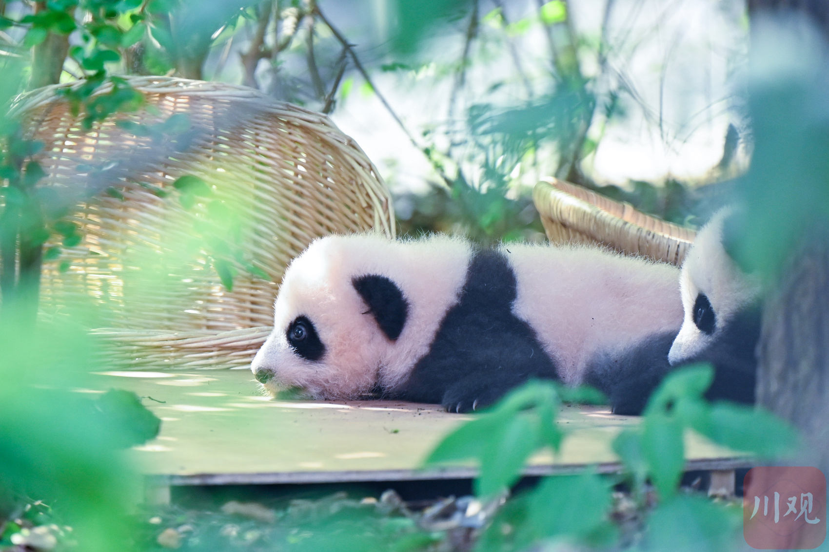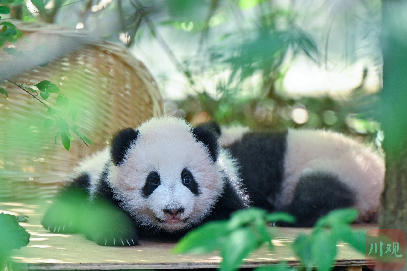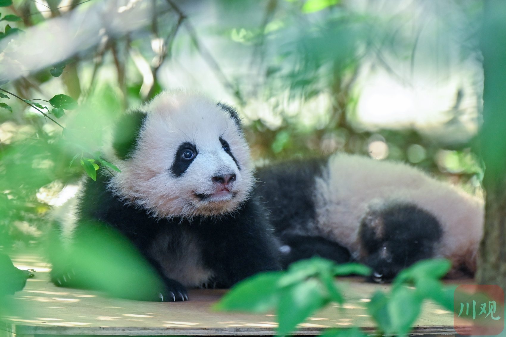 一只熊猫幼崽在绿植环绕的平台上东张西望,模样十分可爱。