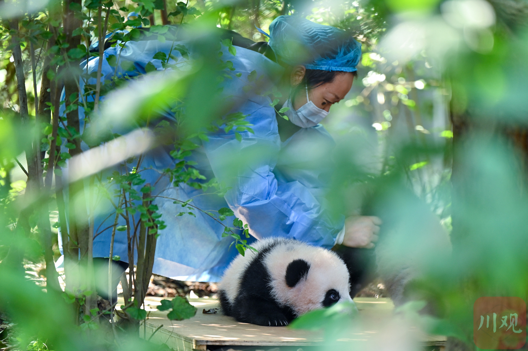 熊猫繁育研究基地的饲养员在照料大熊猫幼崽。