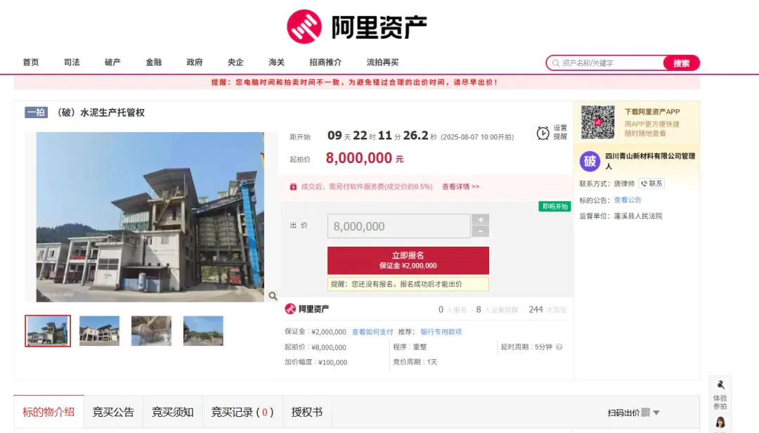 7月28日,川商传媒记者在阿里资产注意到,四川青山新材料有限公司水泥生产托管权即将开拍,起拍价800万元/年。