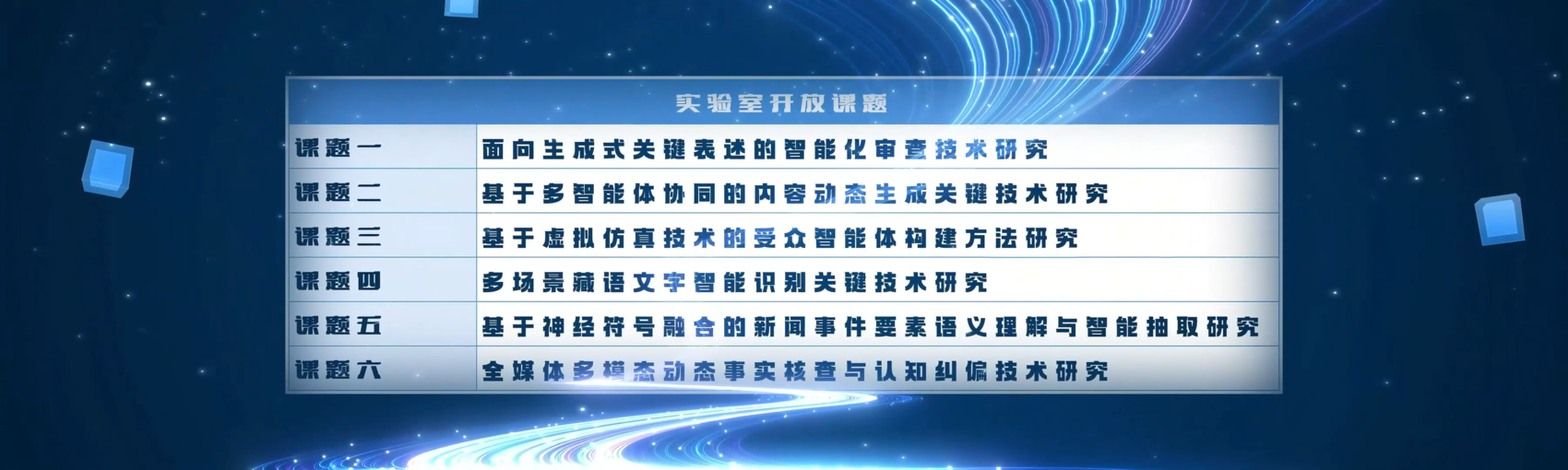 实验室同步发布首批6个开放课题:面向生成式关键表述的智能化审查技术研究;基于多智能体协同的内容动态生成关键技术研究;基于虚拟仿真技术的受众智能体构建方法研究;多场景藏语文字智能识别关键技术研究;基于神经符号融合的新闻事件要素语义理解与智能抽取研究;全媒体多模态动态事实核查与认知纠偏技术研究。