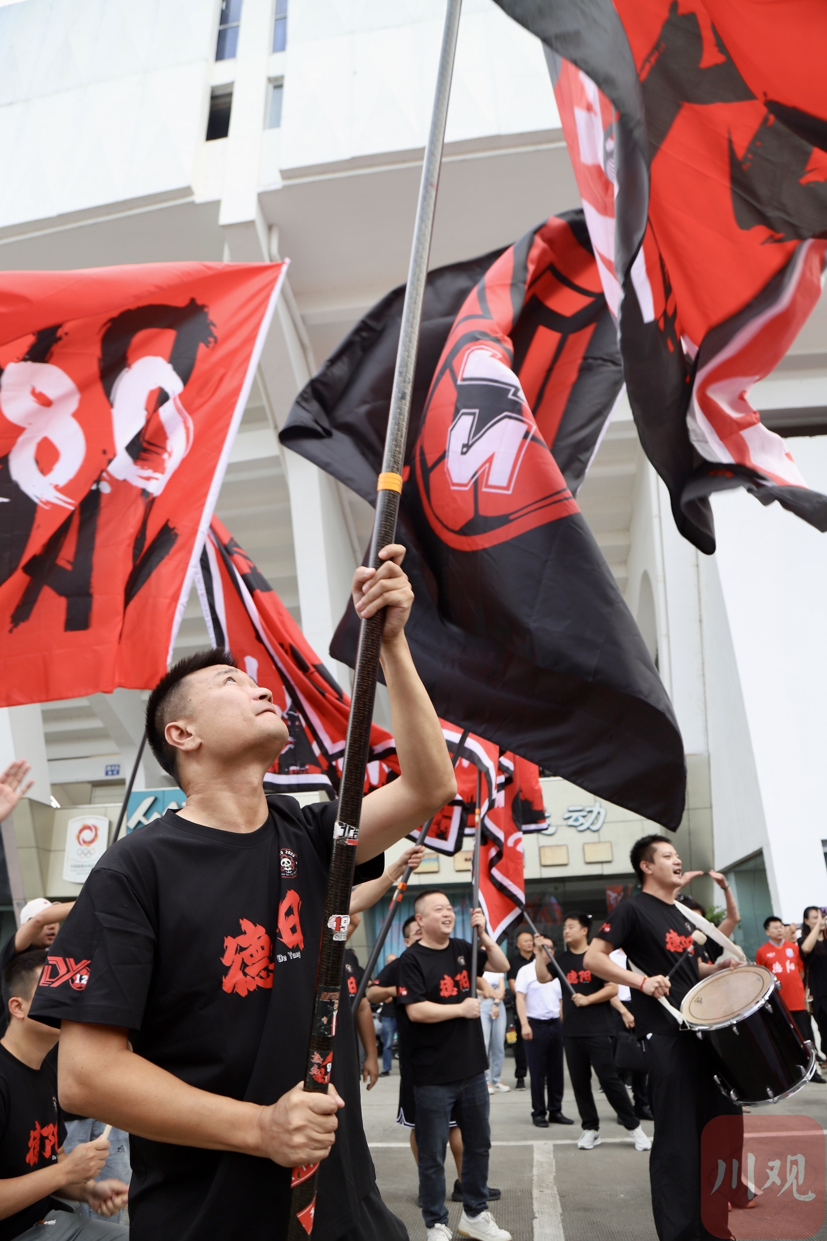 当天上午,德阳重装队出征仪式在德阳市体育公园火热举行。助威团、球迷和自发前来的市民早早聚集,现场欢呼不断、旗帜飞扬,呐喊声、掌声、歌声与鼓声交织,为球队注入满满能量。