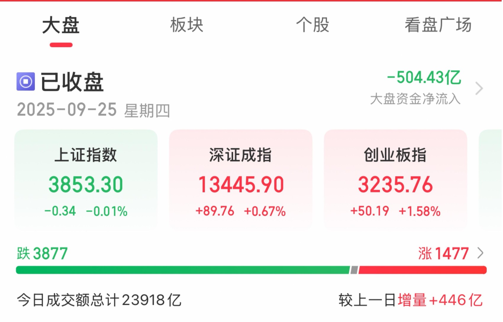 9月25日,A股三大指数涨跌不一。截至收盘,上证指数跌0.01%,收报3853.30点;深成指涨0.67%,收报13445.90点;创业板指涨1.58%,收报3235.76点。全市场全天成交额23918亿元,较上日放量446亿元。全市场超3800只个股下跌。