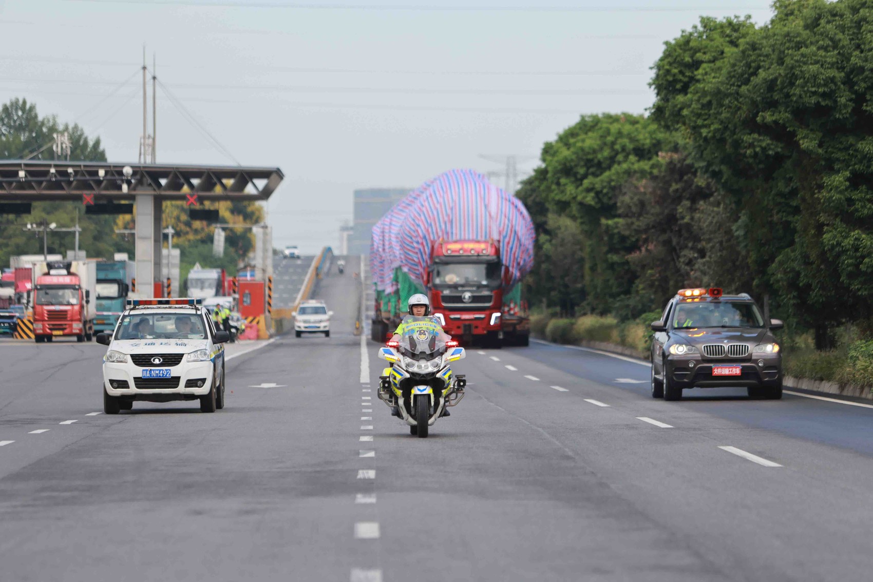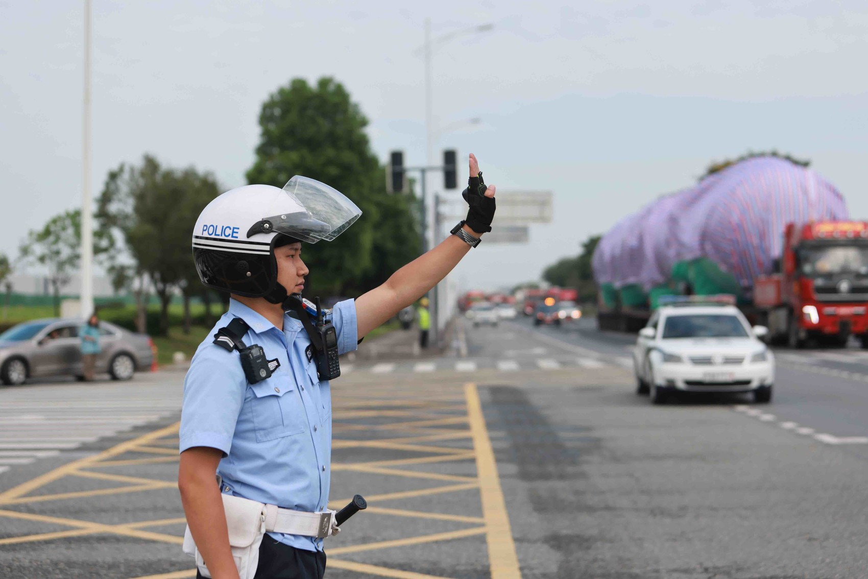 车队经德阳、广汉驶至青白江同华大道,成都交警由此接棒。成都市公安局交通管理局秩序处静态科副科长梅晓飞带队,负责此次大件运输车队在成都境内的保障。
