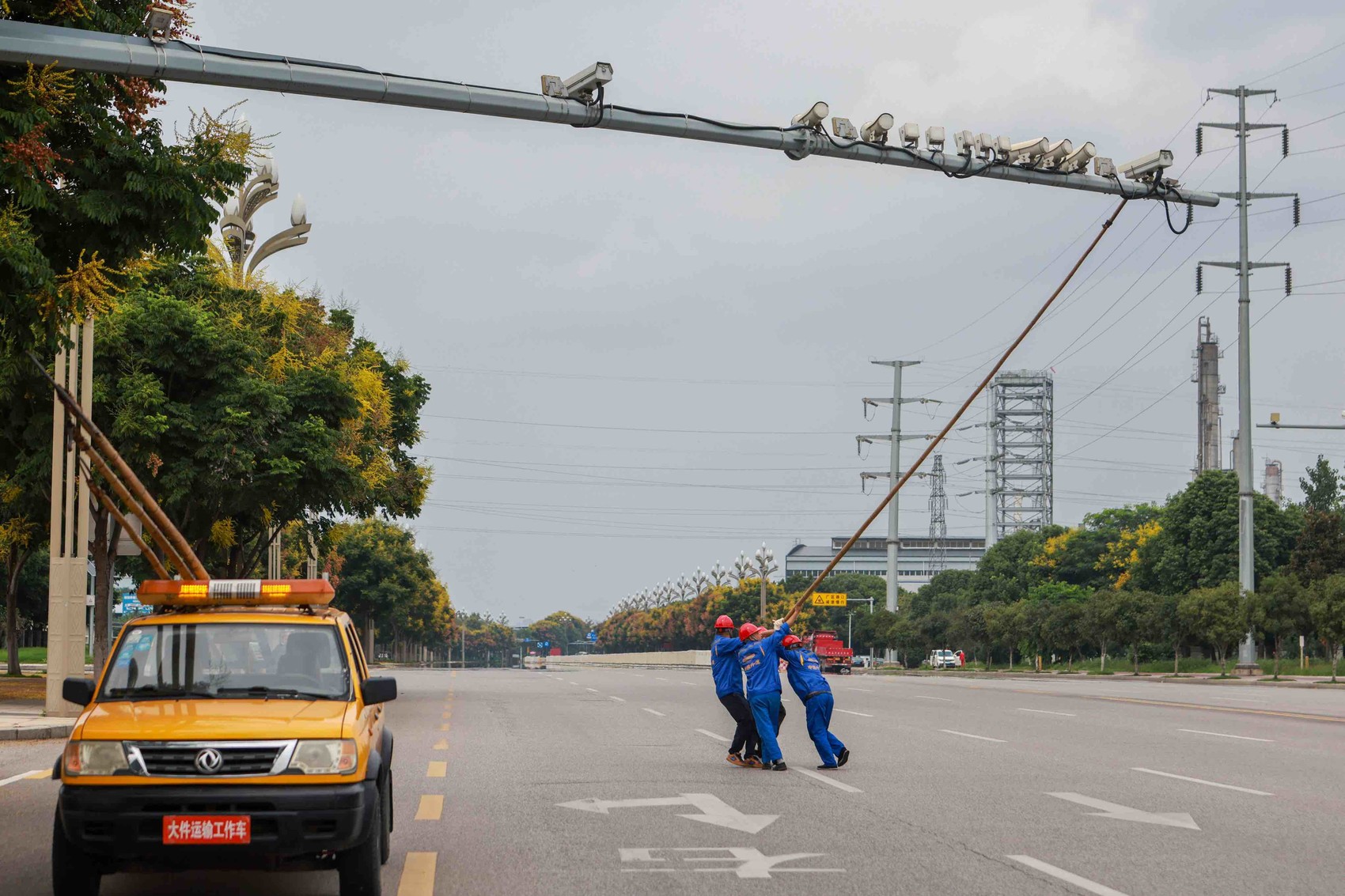 他们用自制工具将红绿灯杆拉开,待车队通过后,立即将灯杆拉正复位,避免影响交通。多年的“押镖”,让“镖师”们配合默契,“这一路有多少个‘障碍’,我们都记在心里了。”负责排障的廖明丹说。