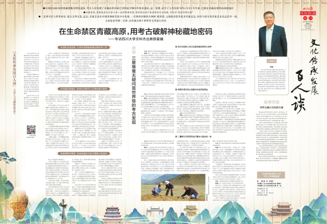 四川日报全媒体“文化传承发展百人谈”大型人文融媒报道持续推出,今日《四川日报》连版推出第九十七期,专访四川大学文科杰出教授霍巍。