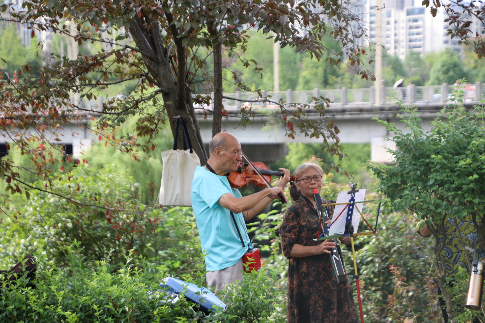 走进百节溪公园,秋阳下,老人正在弹奏乐器。