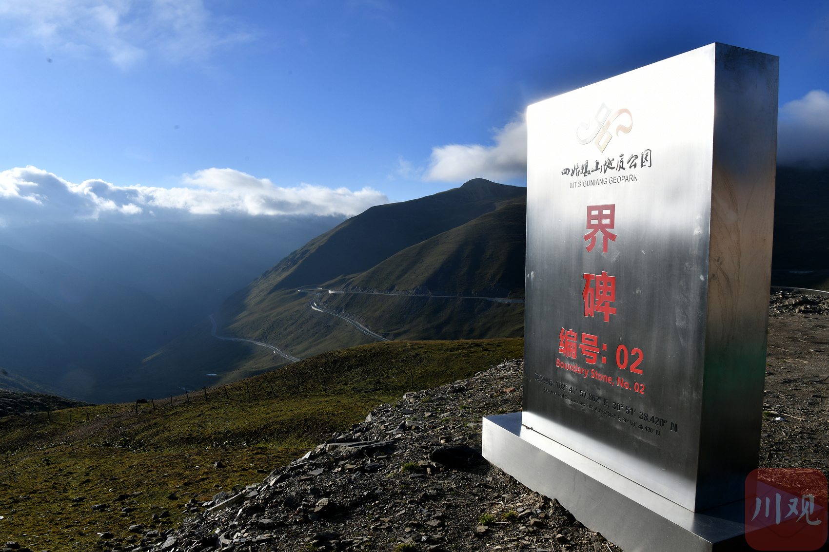 在夹金山垭口处立的四姑娘山地质公园界碑。