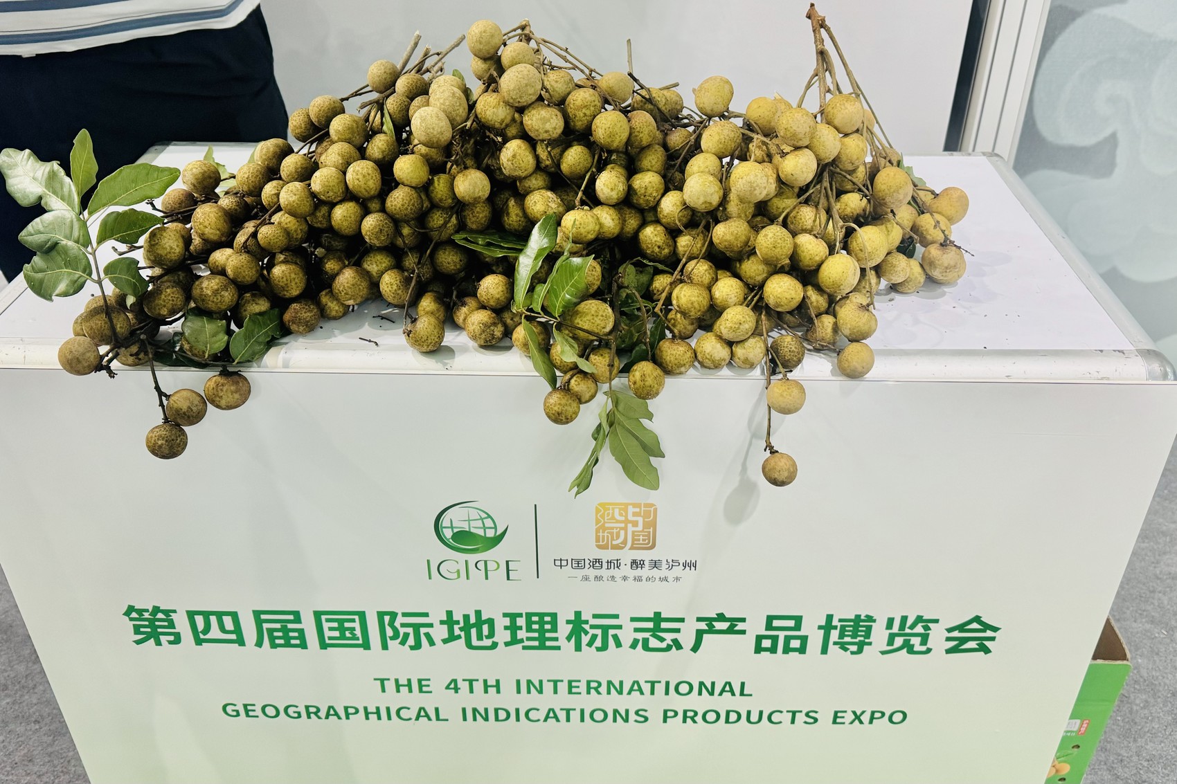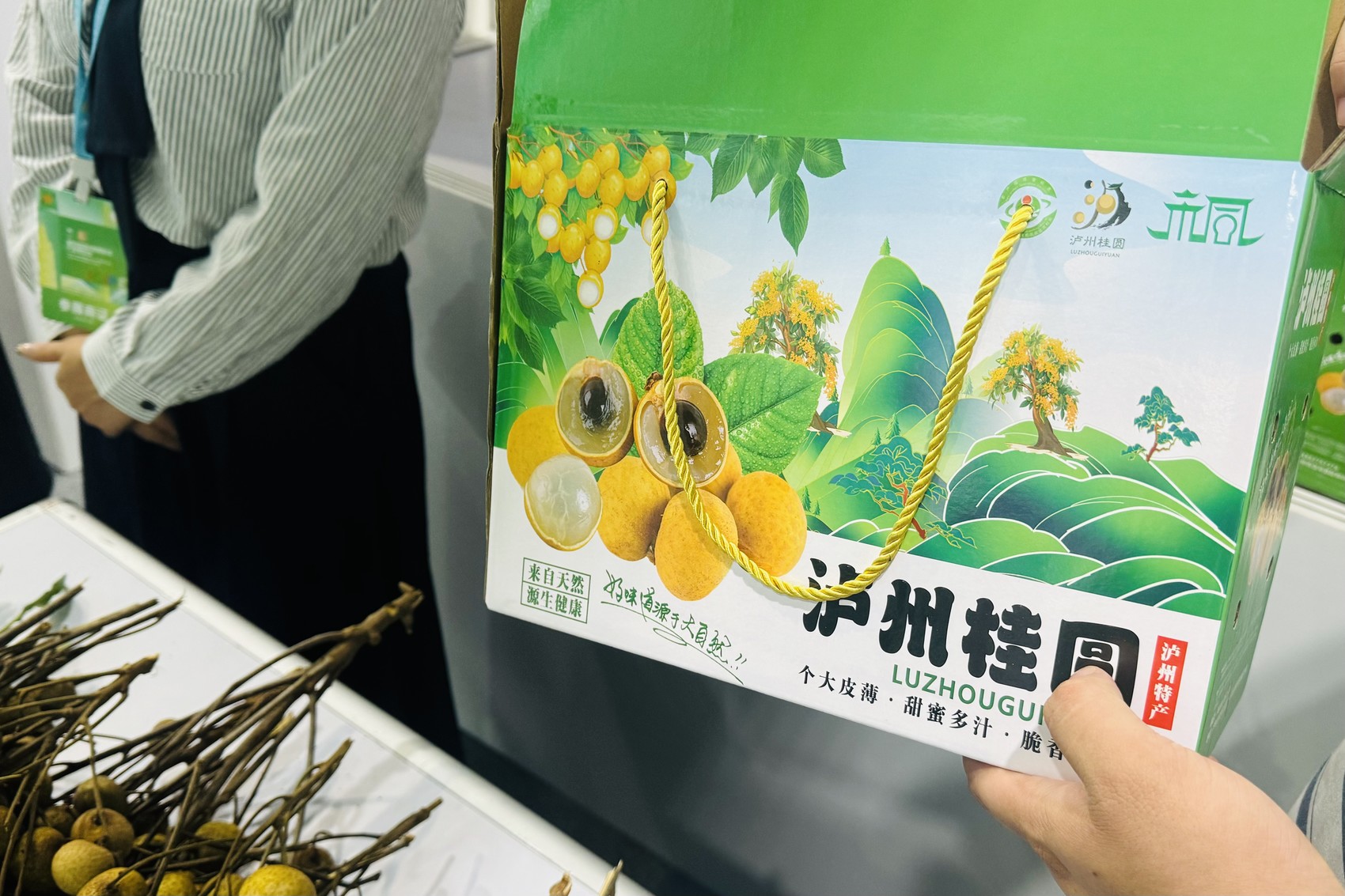 在展销鲜桂圆的白色桌子后方的展柜上,还放着印有“泸州桂圆”品牌logo的包装盒。半个月前,泸州正式对外发布“泸州桂圆”区域公用品牌,此次博览会,印有“泸州桂圆”的国家地理标志证明商标,便随泸州的晚熟龙眼出现在了展销现场。