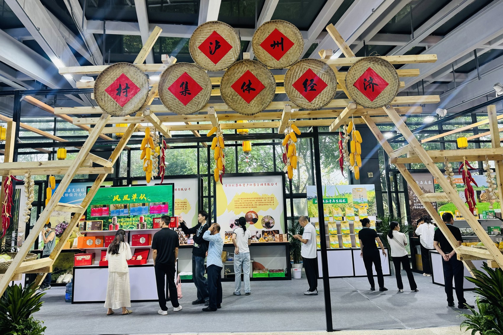 除了带有泸州特色的应季水果,在泸州村集体经济展区,几十种来自全市各区县的农特产品集结在此:稻虾米、麻辣大头菜、鸽子蛋、鸵鸟蛋、手撕娃娃鱼、花椒、竹笋等走出乡村,出现在了这场国际地标博览会。