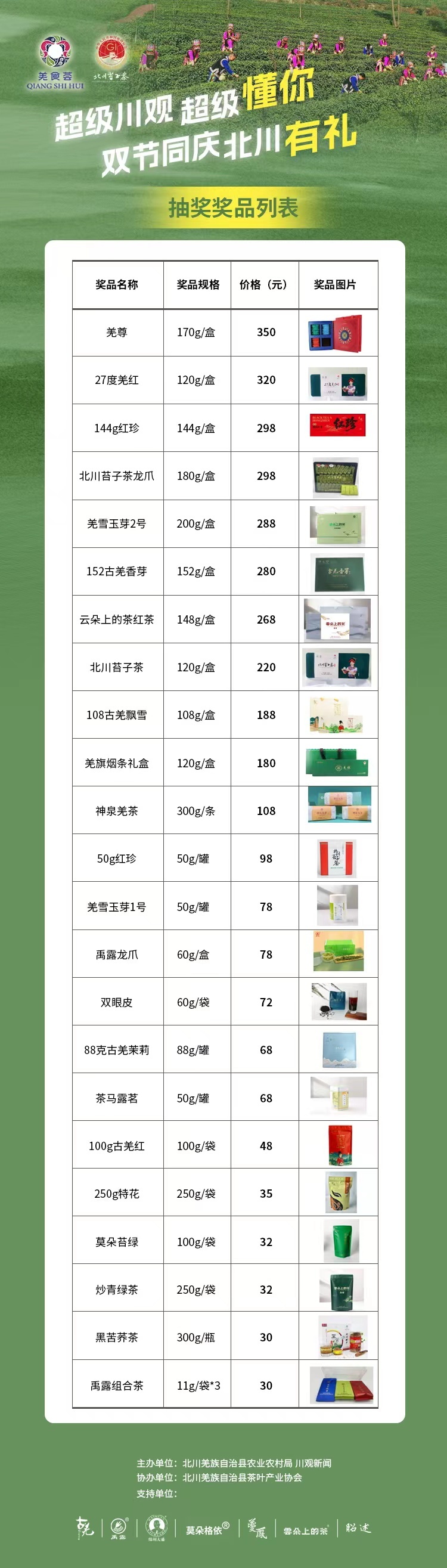 本次活动,由北川羌族自治县农业农村局和川观新闻联合主办,北川羌族自治县茶叶产业协会协办。北川莫朵格依、绵州大盛 、夔凤 、禹露 、云朵上的茶 、古羌茶业 、茗丹家庭种植农场等7家北川茶叶企业作为支持单位,为大家准备了多达23个品类的数百件北川苔子茶作为活动奖品。