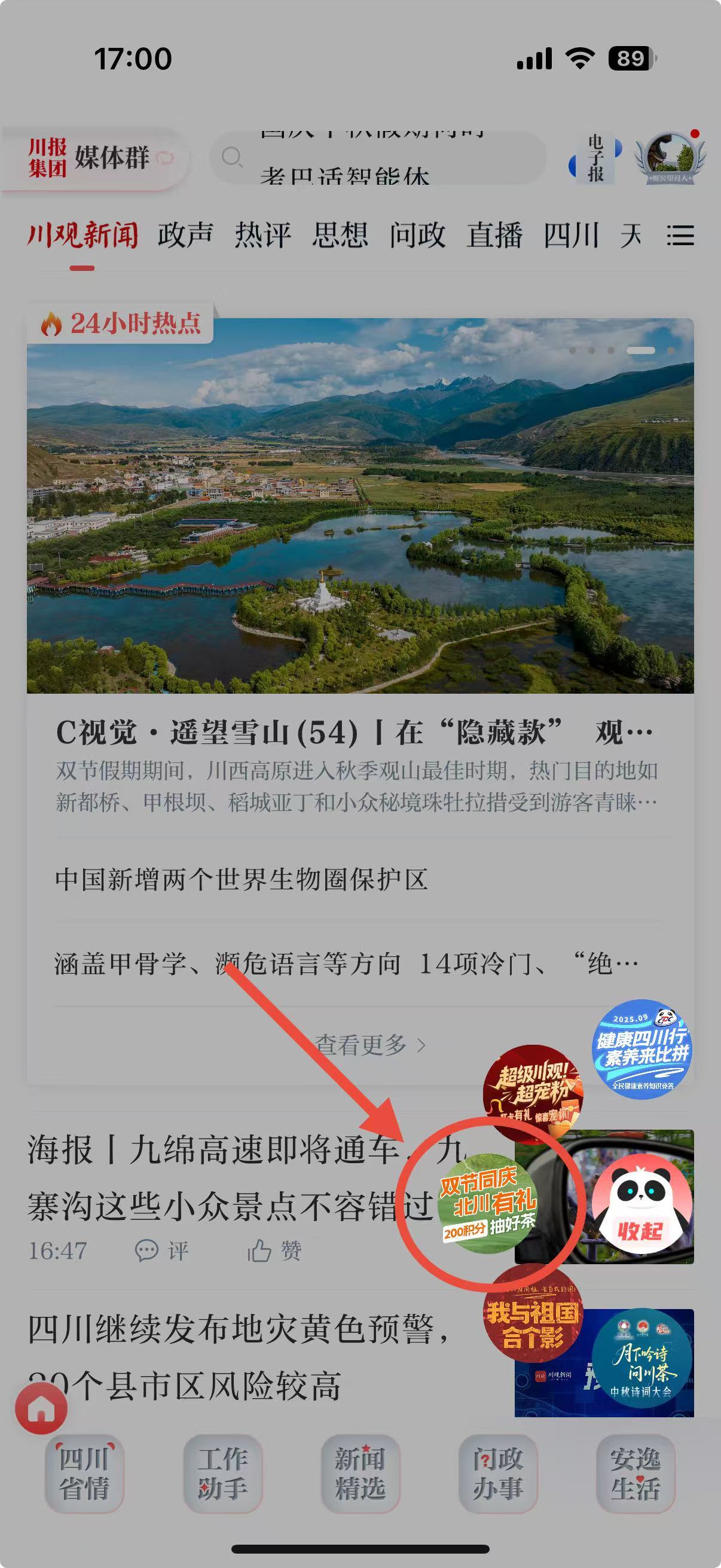 第二步:打开川观新闻客户端,您可以通过以下三种方式找到“双节抽奖”活动通道: