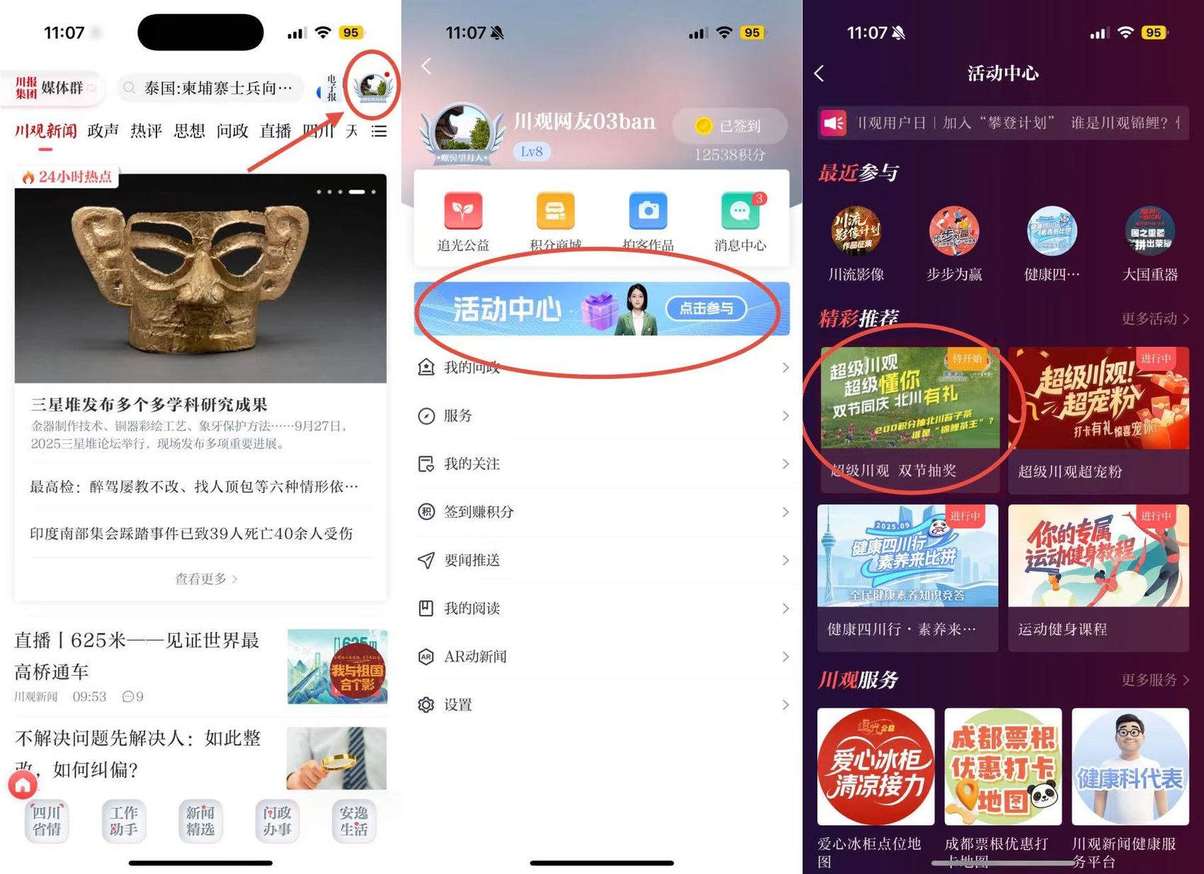 方式二:在川观新闻首页,点击右上角“我的”,再点击“活动中心”,找到“双节抽奖”活动通道图片,点击即可参与抽奖;