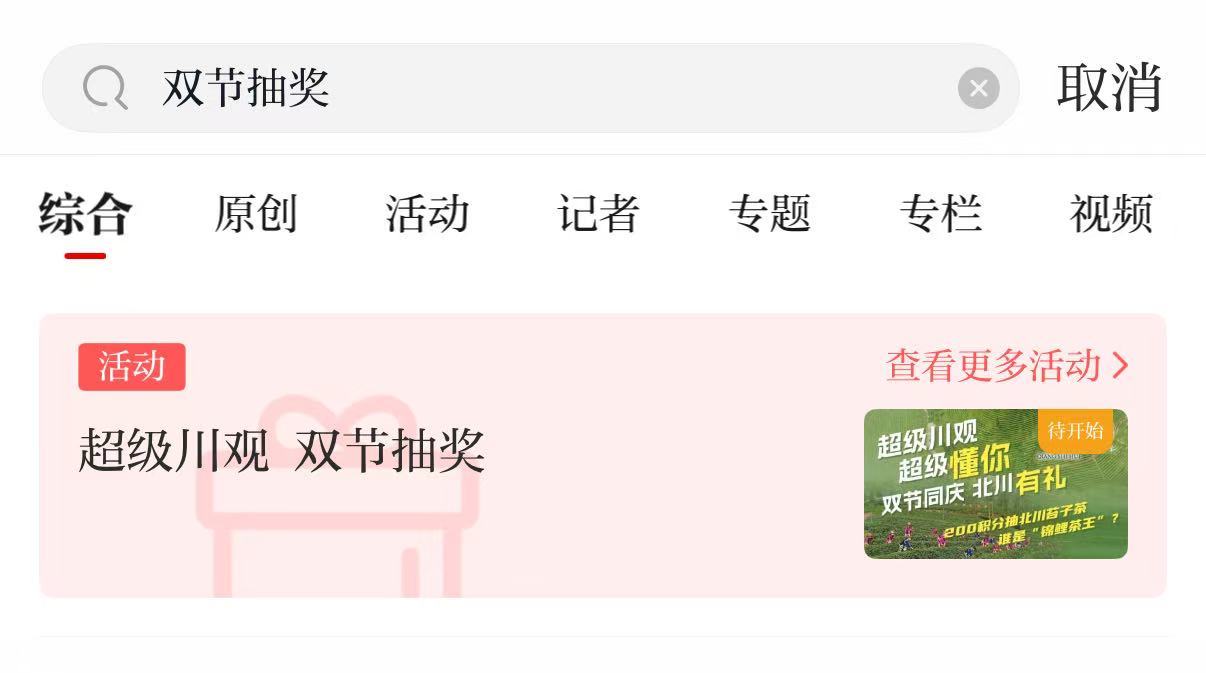 方式三:在川观新闻首页顶部搜索框输入“双节抽奖”,点击活动链接即可参与抽奖。