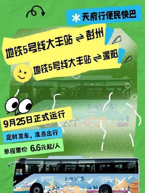 “彭州v5号线”旅游直通车往返地铁5号线大丰站和南部新城客运枢纽站,行驶时间40分钟。发车间隔平均30分钟/班,彭州至大丰方向开行时间为06:00至19:00;大丰至彭州方向为07:30至20:30。全线设地铁5号线大丰站、天府中药城站、南部新城客运枢纽站三个站点。