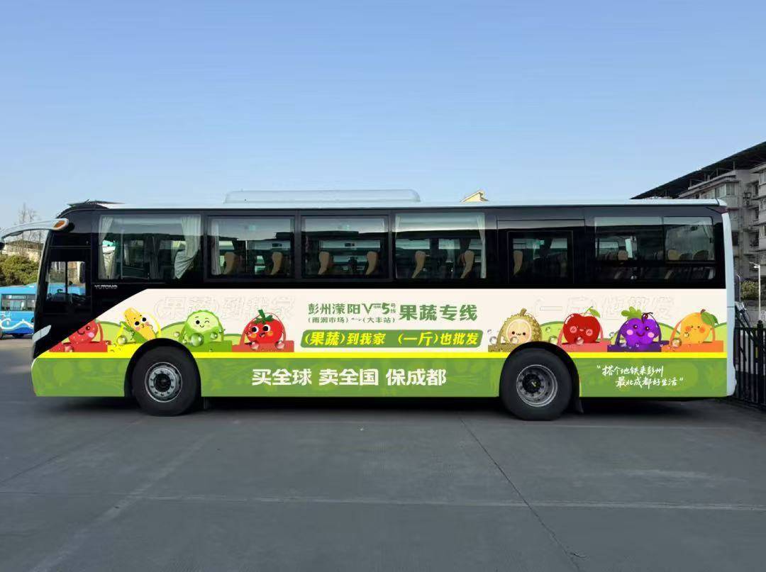 “彭州V5号线”果蔬专线往返地铁5号线大丰站和彭州濛阳雨润市场,行驶时间50分钟。发车间隔平均30分钟/班。濛阳至大丰方向开行时间为:08:20至14:30;大丰至濛阳方向开行时间为:09:30至15:40。全线设地铁5号线大丰站和濛阳雨润市场站两个站。