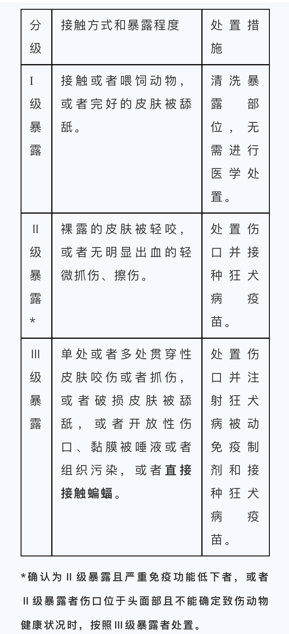 第三,根据接触方式和暴露程度将狂犬病暴露分为三级,只有Ⅰ级和Ⅱ级暴露适用,Ⅲ级暴露风险大不建议采用。