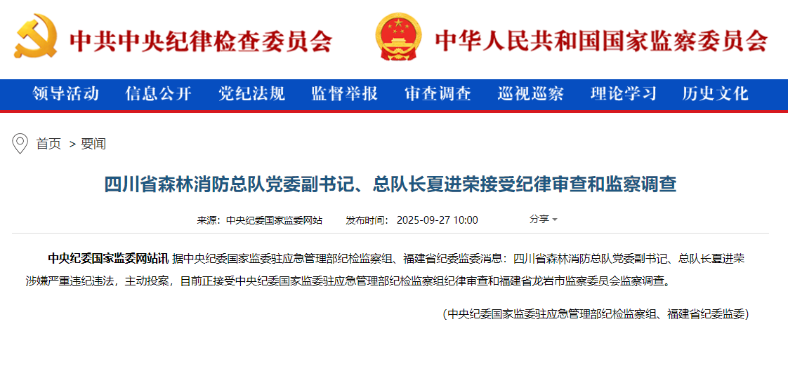 中央纪委国家监委网站讯 据中央纪委国家监委驻应急管理部纪检监察组、福建省纪委监委消息:四川省森林消防总队党委副书记、总队长夏进荣涉嫌严重违纪违法,主动投案,目前正接受中央纪委国家监委驻应急管理部纪检监察组纪律审查和福建省龙岩市监察委员会监察调查。
