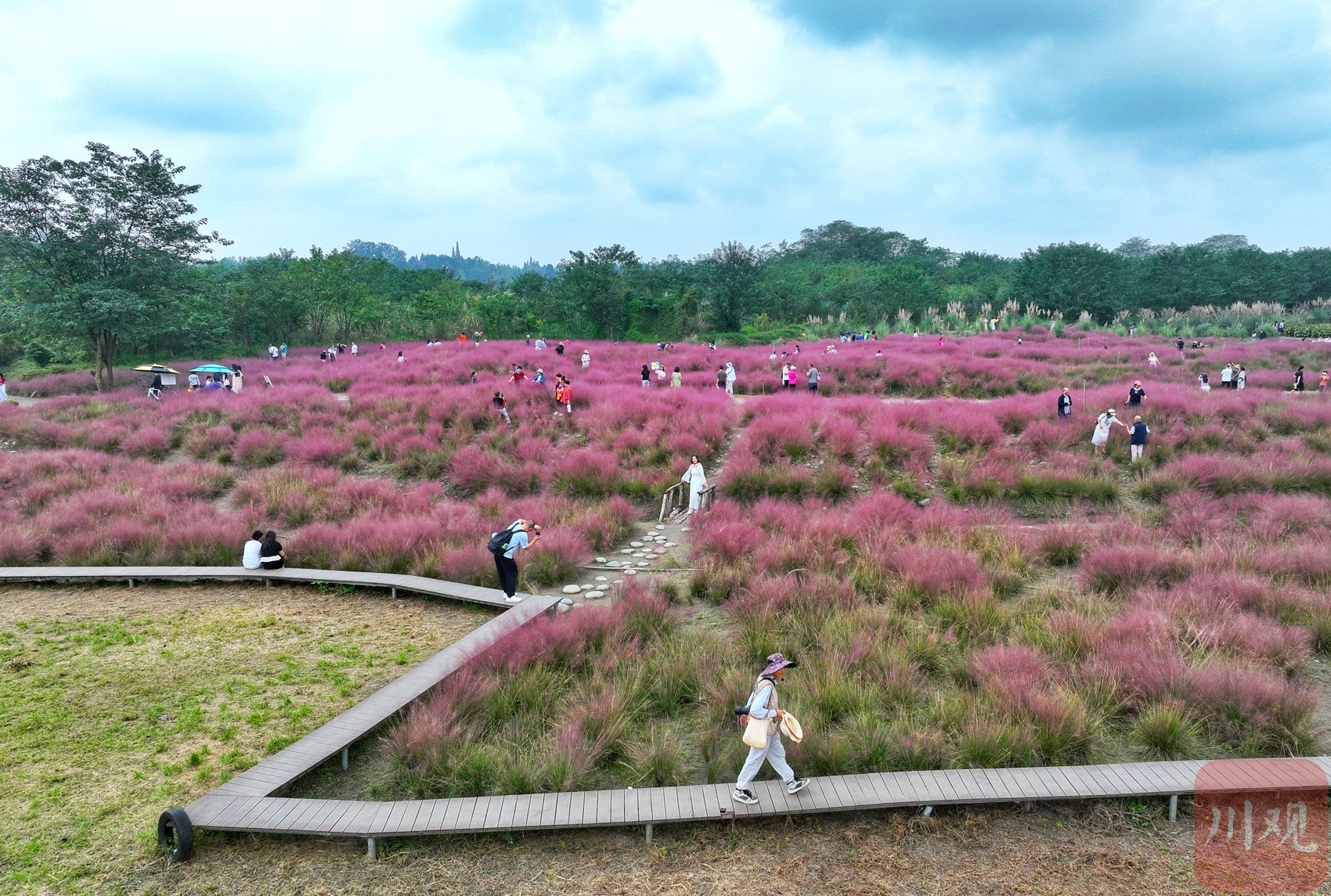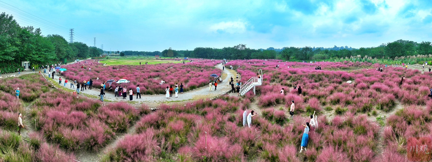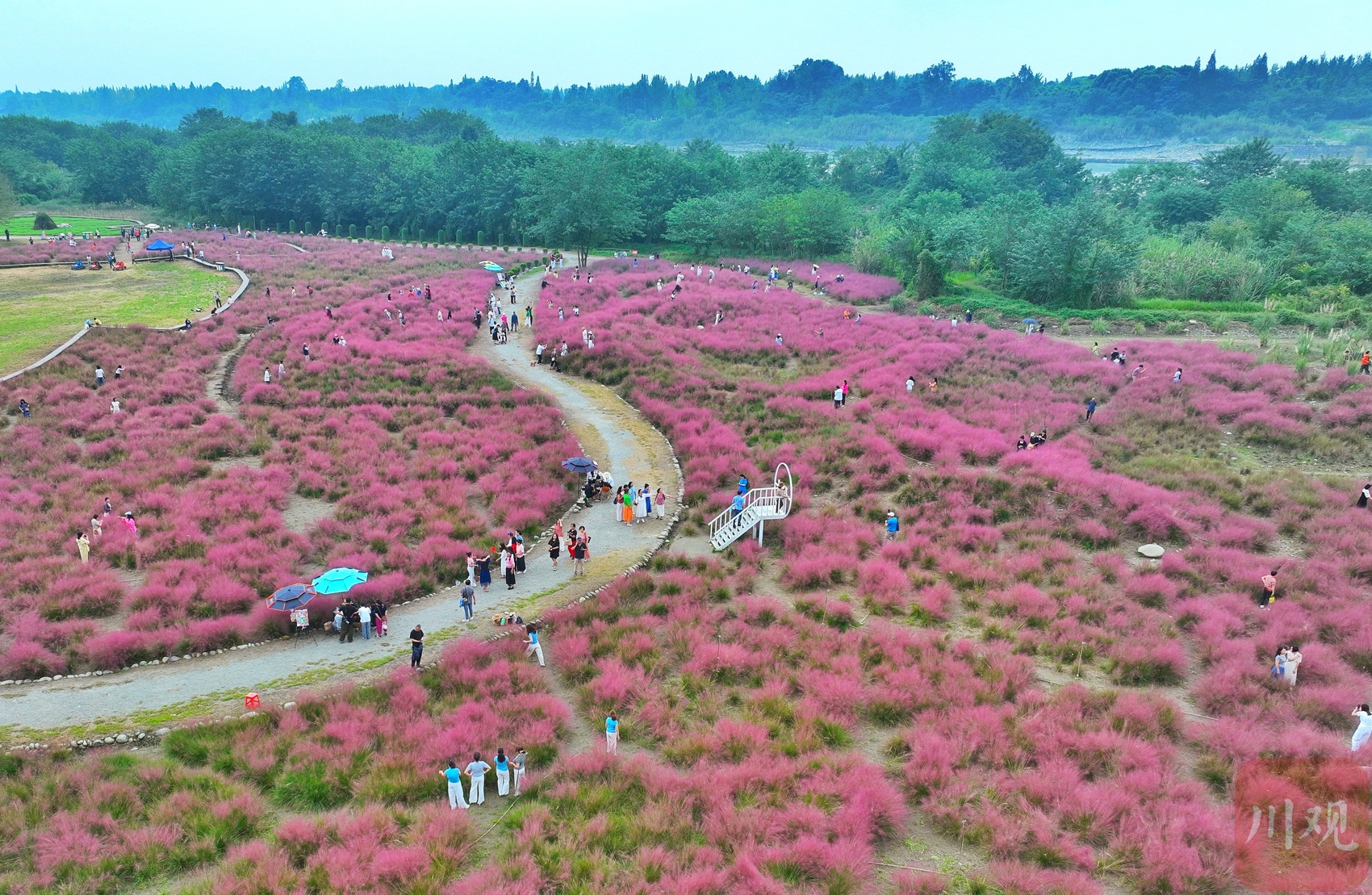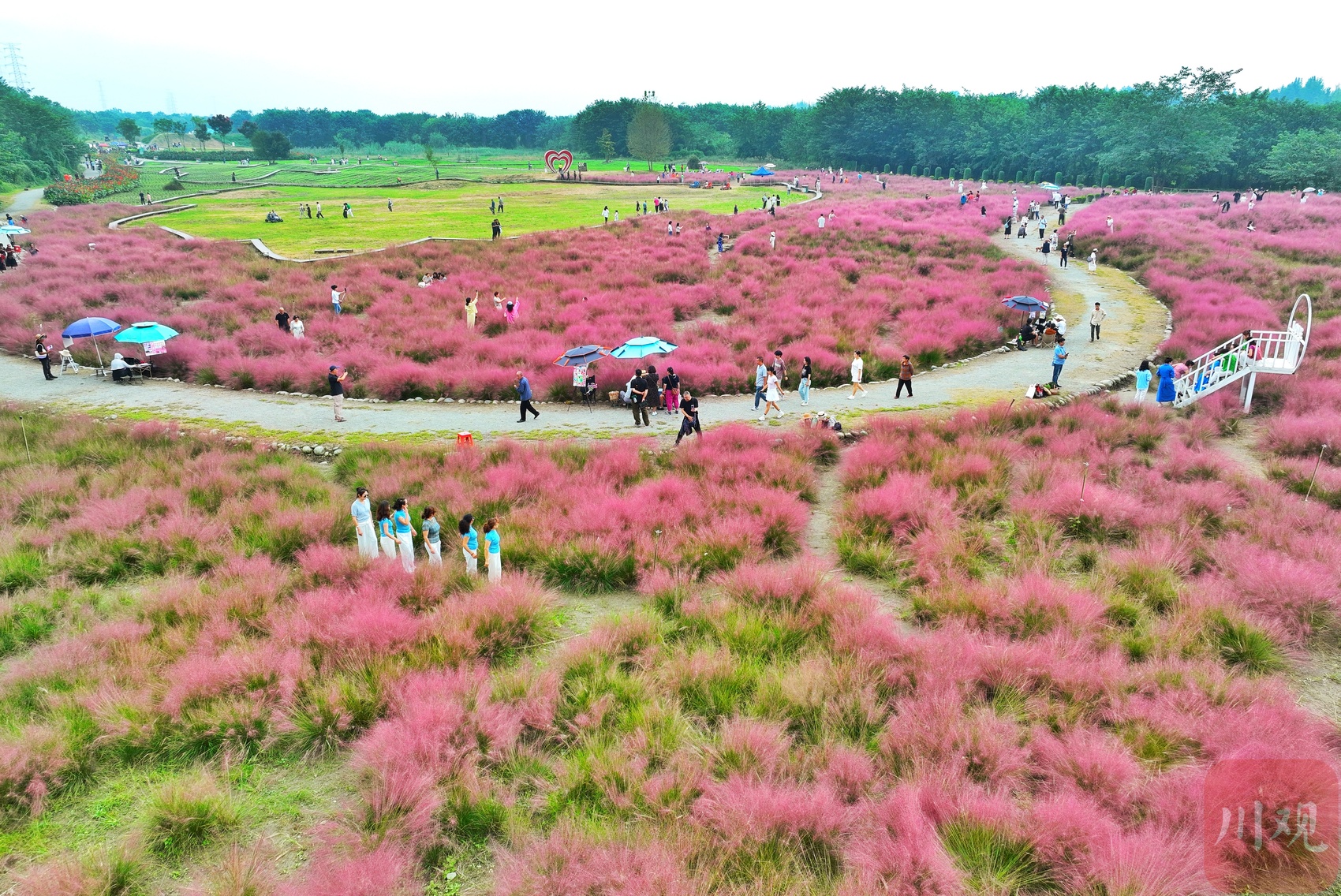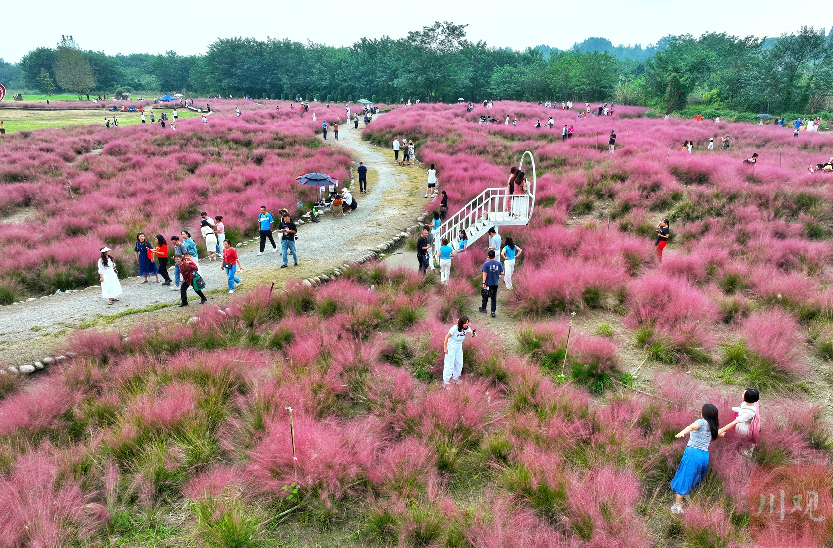 9月27日,正值周末,成都温江区汪家湾花海进入赏花季。成片的粉黛乱子草呈现出浪漫的粉色云雾状景观,在网络上迅速走红,吸引众多市民前往观光打卡。