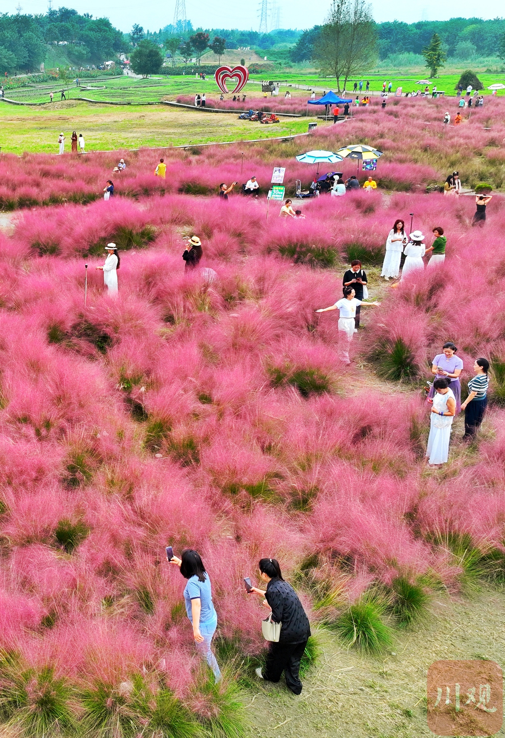 游人在温江汪家湾花海粉黛乱子草拍照打卡。