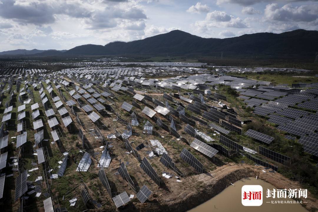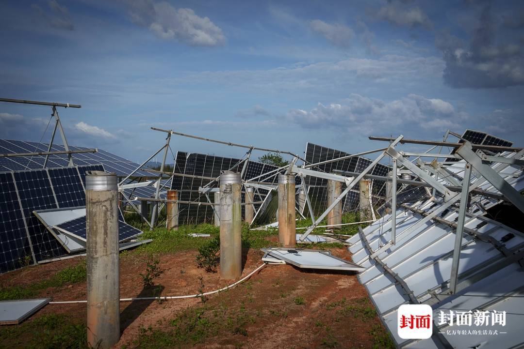 除了风电场外,9月26日下午,封面新闻记者在阳东区大沟镇鑫业光伏电站看到,占地面积1700亩的光伏发电板在强风雨中大片受损,许多发电板被吹卷变形,飞出铁网散落一地,该电站2015年8月投产,设计寿命25年,年发电量5700万度电。