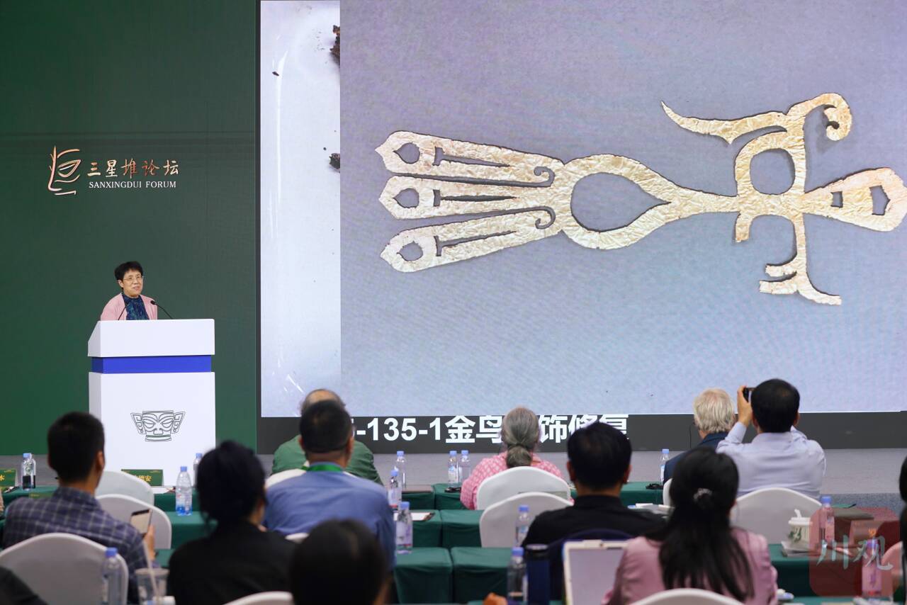 几年前,三星堆遗址5号坑出土的黄金面具一经面世便惊艳世人。三星堆人为何喜欢用金?他们的黄金制品的加工水平在同时期的中国又处于何种水平?9月27日,2025三星堆论坛分论坛“文明解码”在德阳举行。著名金器保护专家,国家博物馆青铜研究所原研究员马燕如在现场分享了三星堆金质文物的最新研究成果。据她介绍,三星堆出土金器初步统计约有两公斤,无论从黄金用量,还是金质文物制作的工艺复杂程度来看,三星堆的金质文物制作堪称代表了早期中国贵金属工艺的巅峰。