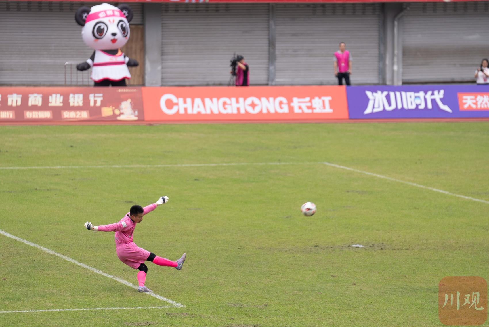 雅安貊貊队守门员正在开球,球场外出现的“大熊猫”是雅安貊貊队的吉祥物“貊雅雅”。