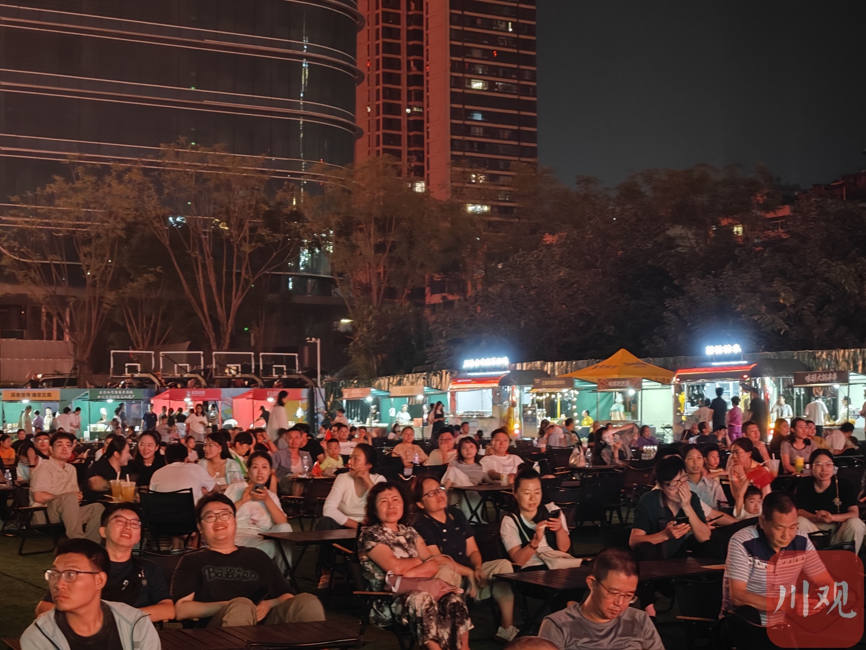 晚上7点半,大屏幕切换到宜宾市体育中心的实时比赛画面。当宜宾长江首城队与自贡灯城燊龙队球员开始热身时,“雄起”的呐喊声此起彼伏。“今天是宜宾队的主场,虽然不在体育场内,但在这里看转播同样氛围十足!”球迷王磊笑着说,他和朋友早早赶到这里,备好了烧烤、卤味和现切水果,静待比赛开始。