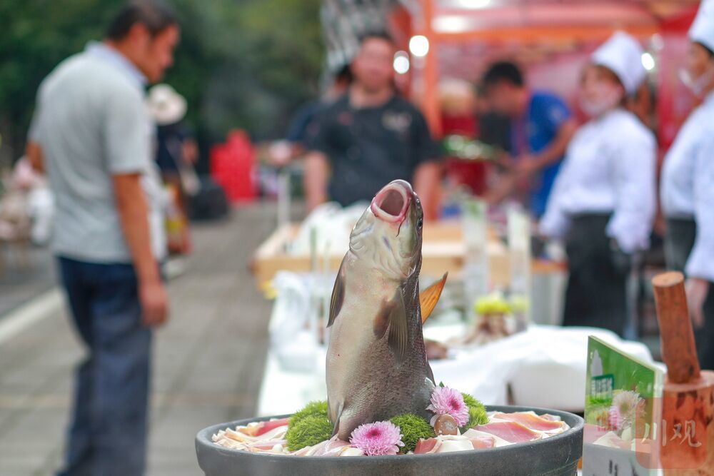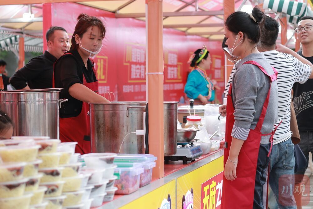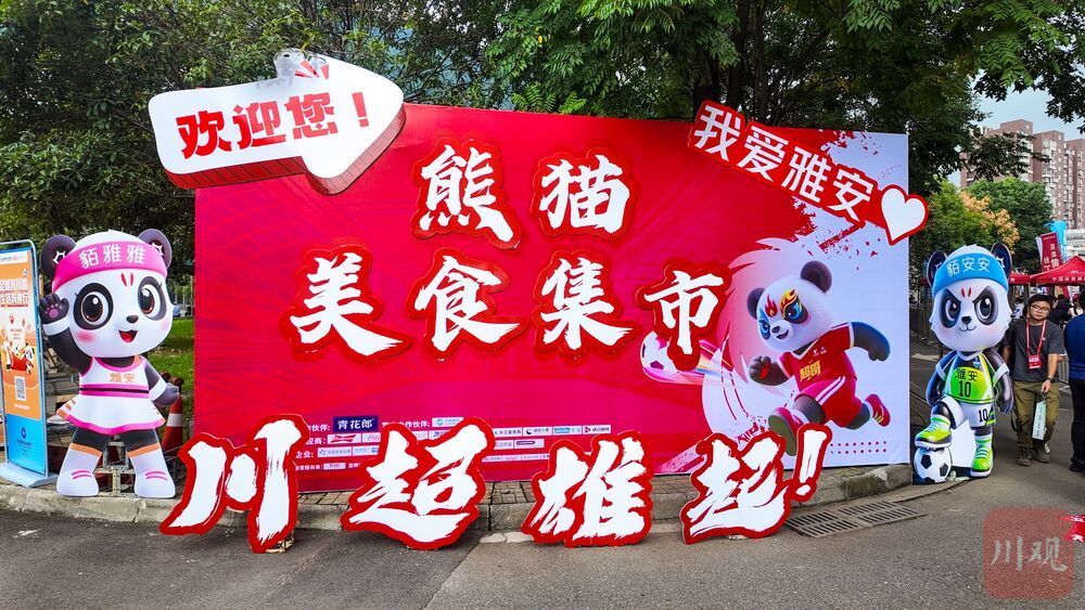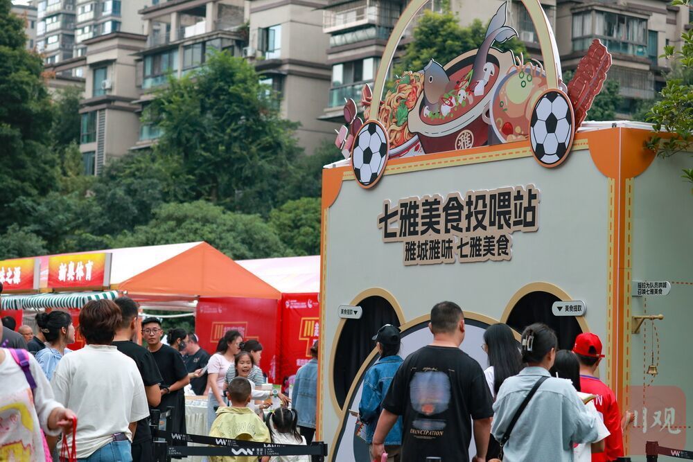 走出球场外,雅安在雅安市体育场内重点推出“川超有你 雅安有礼”农特美食展销,设置50余个展位集中展销棒棒鸡、挞挞面等百余款特色产品。雅安的宝兴藏香猪肉、名山羊肉汤、雨城区雅鱼等飘香,还有乐山的文创、甜皮鸭等售卖。“我们的藏香猪肉原价68元每斤,今天打了七折,已经卖出去几千块钱了。”宝兴硗碛村民胡丽说道,她们要从比赛当天到国庆8天共参展9天,还准备了大量藏香猪腊肉、牦牛肉等特色产品供免费试吃,希望向游客展示雅安风味。