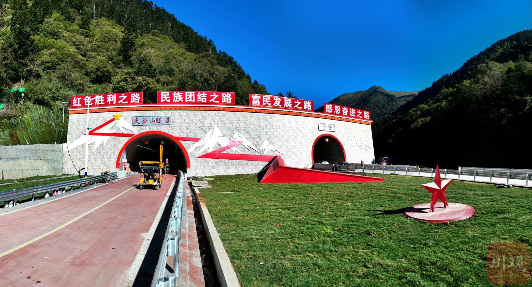 90年前,中央红军长征途中翻越的第一座大雪山就是夹金山。宝兴端的夹金山隧道口外墙的设计,再次展现了这一历史壮举。一条红色的折线从地面延伸到墙面,穿行于白色雪山之间,象征着红军翻山行进的路线,山顶上立起一颗黄色五角星,象征成功翻越。