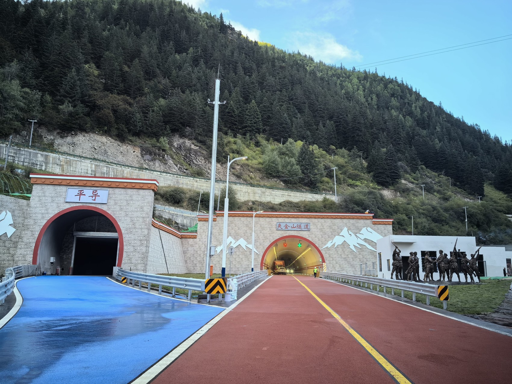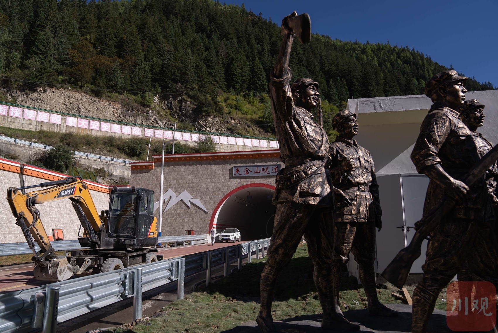 通过隧道,即来到了小金县,隧道出口处修建了雕塑群像,翻过夹金山后,红一方面军和红四方面军在小金县的达维镇成功会师,雕塑所表现的正是会师场景。从翻越到穿越,红军精神历久弥新。