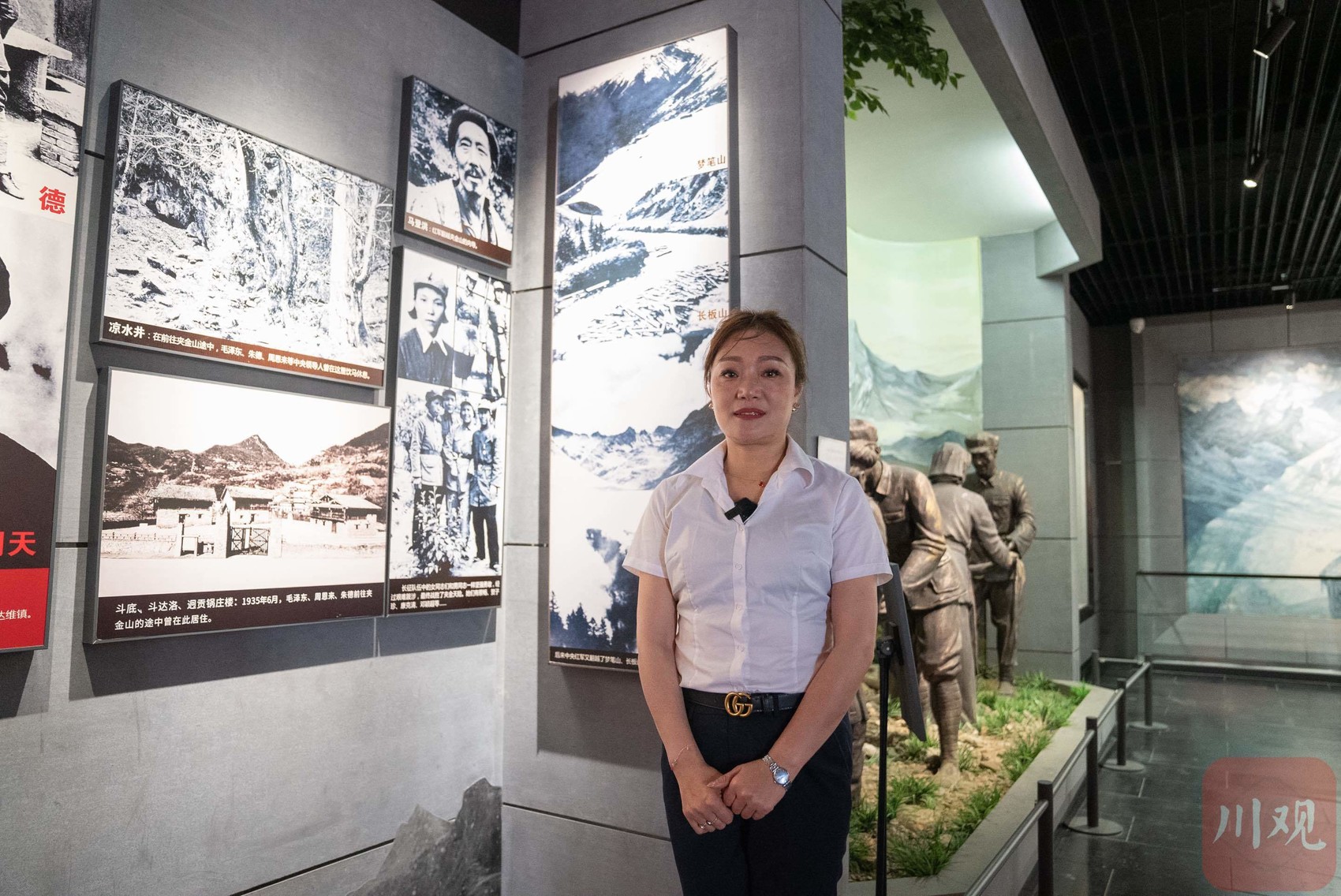 马花在宝兴县红军纪念馆,左上角的照片为他的爷爷马登洪