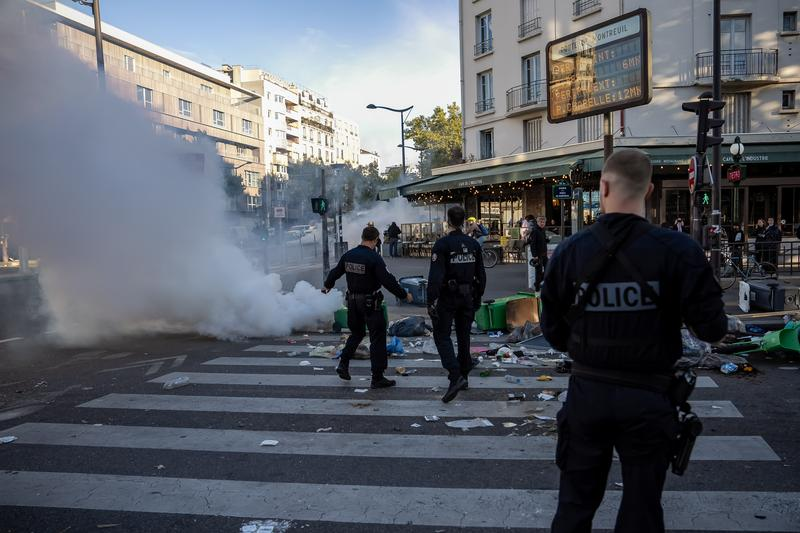 9月10日,在法国巴黎街头,警察阻止示威者用垃圾桶封锁街道。法国多座城市10日发生大规模游行示威,抗议前任总理贝鲁此前提出、旨在削减财政支出的预算草案。部分地方出现暴力行为,数百人被捕。 新华社发(奥雷利安·莫里萨尔摄)