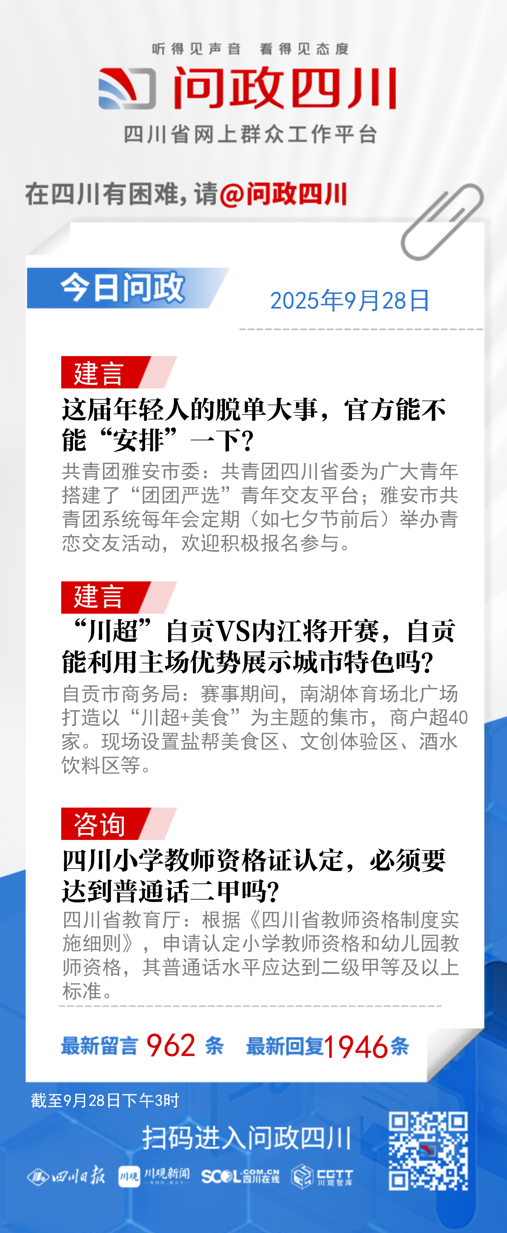 问政四川网友建议:帮助大龄青年解决婚恋问题、实现 “脱单”,相关单位应主动承担责任,可以通过多种形式为他们创造条件:如搭建多元化的信息交流平台,为广大大龄青年提供相识、相知的渠道,助力他们早日组建家庭。