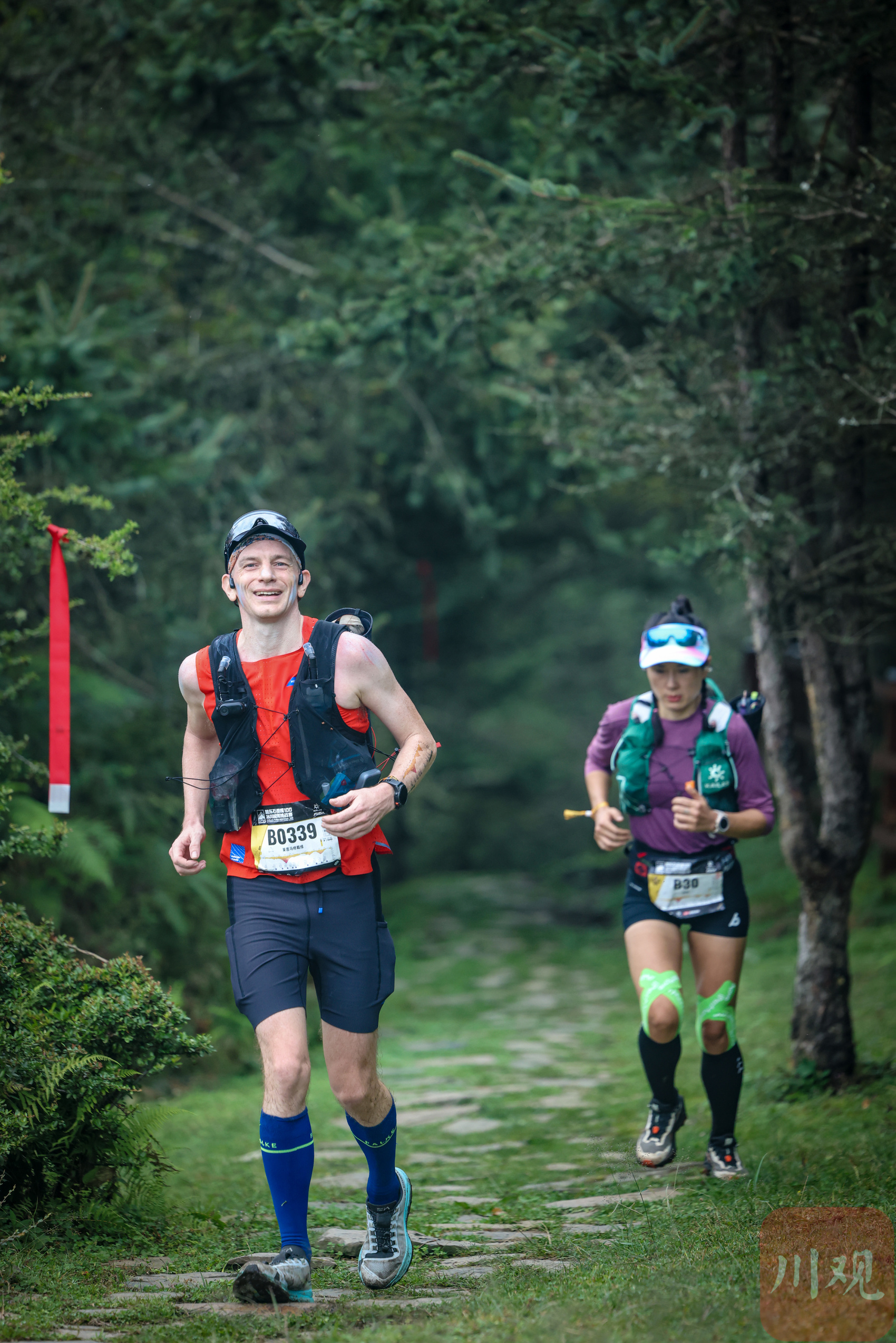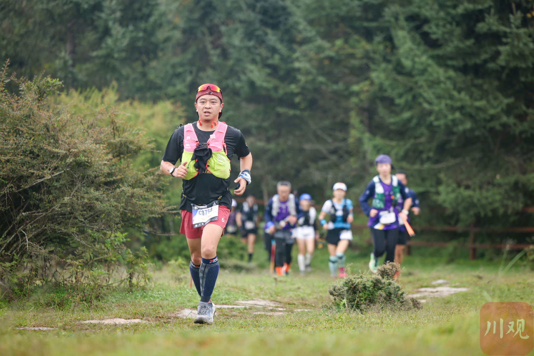 选手们身着专业越野装备,奔跑在森林里的赛道。