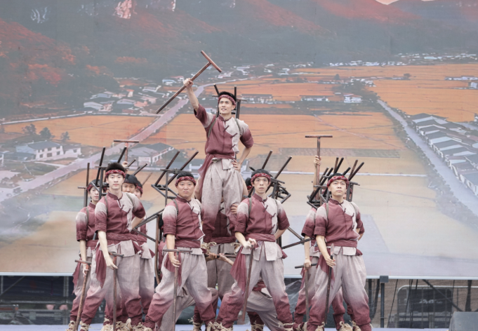 “开秧门咯!”随着一声响亮的号子,南充市仪陇县回春镇的节目《春潮绽放》第一个上台竞演。肩挑秧苗、身背农具的演员们,生动演绎了插秧、施肥、收割、晾晒等农忙景象,展现乡村劳作之美。