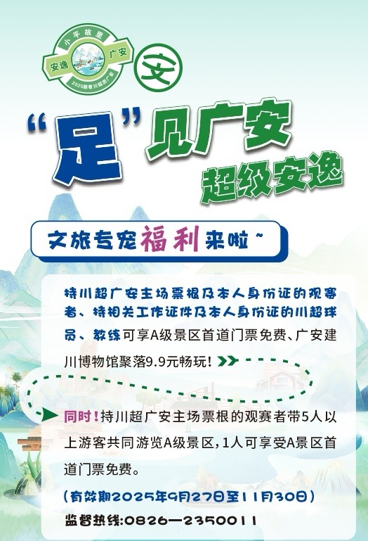此次广安推出的文旅福利堪称“豪华套餐”。记者从广安市文化广播电视和旅游局获悉,9月27日至11月30日,持川超广安主场票根及本人身份证的观赛者、持相关工作证件及本人身份证的川超球员、教练可享 A 级景区首道门票免费、广安建川博物馆聚落9.9元畅玩。持川超广安主场票根的观赛者带5人以上游客共同游览 A 级景区,1人可享受 A 景区首道门票免费。不仅如此,广安还联动民宿、星级宾馆,推出免减等优惠促销政策,让球迷在观赛之余,以实惠价格享受舒适的住宿环境。