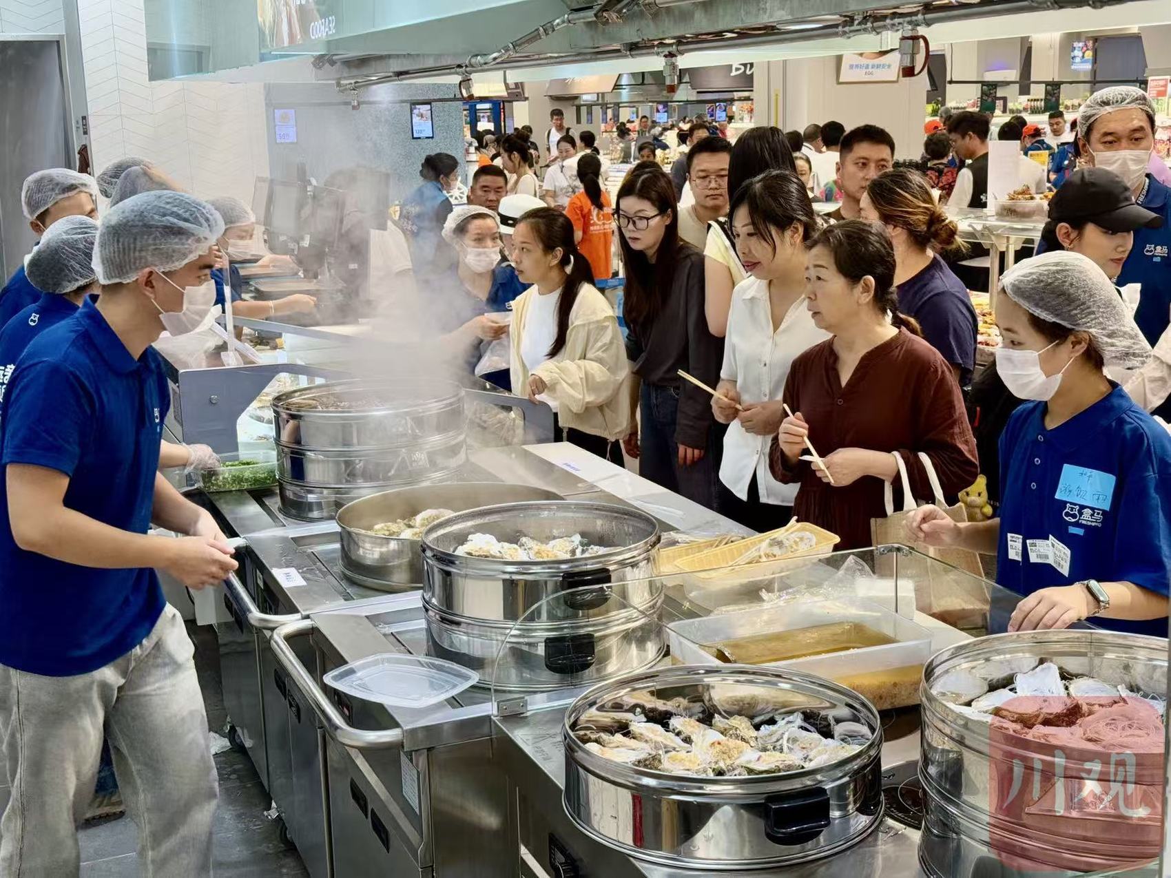 “原来高端海鲜的价格还能如此亲民。”不少消费者在海鲜区发出感叹。现场,梭子蟹、东星斑、三文鱼等全球生鲜商品受青睐,599元一只的帝王蟹被争相抢购。在烘焙区,榴莲千层蛋糕、瑞士卷、贵州省医月饼凭借网红效应,成为不少年轻消费者的热门选择。在店内美食街,各种食材让人眼花缭乱,蒸、炸、炖、煮的香气交织。不少消费者现场下单,体验盒马鲜生现做美食的新鲜美味。