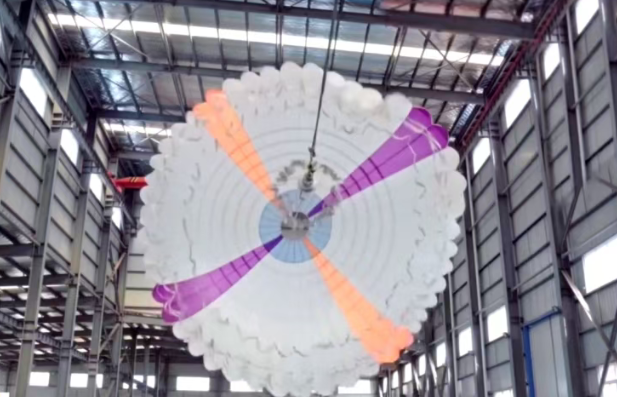 此次交付启运的做功伞是空中组件的核心设备,展开面积达5000平方米,相当于12个标准篮球场,可在500-5000米高度范围内往复捕获风能并带动地面发电设备发电。